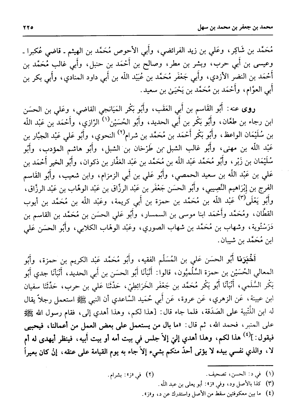 محمد بن شاكر وعلي بن زيد الفرائضي وأبي الأحوص محمد بن الهيثم قاضي عكبرا وعيسى بن أبي حرب وبشر بن مطر وصالح بن أحمد بن حنبل وأبي غالب محمد بن أحمد بن النضر الأزدي وأبي جعفر محمد بن عبيد الله بن أبي داود المنادي وأبي بكر بن أبي العوام وأحمد بن محمد بن يحيى بن سعيد روى عنه أبو القاسم بن أبي العقب وأبو بكر الميانجي القاضي وعلي بن الحسن ابن رجاء بن طعان وأبو بكر بن أبي الحديد وأبو الحسين (1) الرازي وأحمد بن عبد الله بن سليمان الواعظ وأبو بكر أحمد بن محمد بن شرام (2) النحوي وأبو علي عبد الجبار بن عبد الله بن مهنى وأبو غالب الشبل بن طرخان بن الشبل وأبو هاشم المؤدب وأبو سليمان بن زبر وأبو محمد عبد الله بن محمد بن عبد الغفار بن ذكوان وأبو الخير أحمد بن علي بن عبد الله بن سعيد الحمصي وأبو علي بن أبي الزمزام وابن شعيب وأبو القاسم الفرج بن إبراهيم النصيبي وأبو الحسن جعفر بن عبد الرزاق بن عبد الوهاب بن عبد الرزاق وأبو (3) يعلى عبد الله بن محمد بن حمزة بن أبي كريمة وعبد الله بن محمد بن أيوب القطان ومحمد وأحمد ابنا موسى بن السمسار وأبو علي الحسن بن محمد بن القاسم بن درستوية وشهاب بن محمد بن شهاب الصوري وعبد الوهاب الكلابي وأبو الحسن علي ابن محمد بن شيبان اخبرنا أبو الحسن علي بن المسلم الفقية وأبو محمد عبد الكريم بن حمزة وأبو المعالي الحسين بن حمزة السلميون قالوا أنبأنا أبو الحسن بن أبي الحديد أنبأنا جدي أبو بكر السلمي أنبأنا أبو بكر محمد بن جعفر الخرائطي حدثنا علي بن حرب حدثنا سفيان ابن عيينة عن الزهري عن عروة عن أبي حميد الساعدي ان النبي (صلى الله عليه وسلم) استعمل رجلا يقال له ابن اللتبية على الصدقة فلما جاء قال هذا لكم وهذا أهدي إلى فقام رسول الله (صلى الله عليه وسلم) على المنبر فحمد الله ثم قال ما بال من يستعمل على بعض العمل من اعمالنا فيحبيى فيقول (4) هذا لكم وهذاأهدي إلى إلا جلس في بيت أمه أو بيت أبيه فينظر أيهدي له أم لا والذي نفسي بيده لا يؤتى أحد منكم بشئ إلا جاء به يوم القيامة على عنقه إن كان بعيرا
