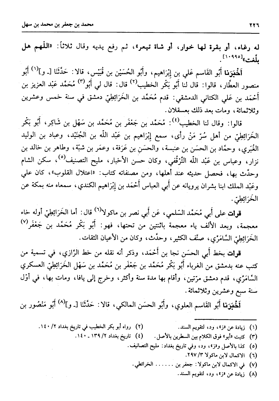 [10995] أخبرنا أبو القاسم علي بن إبراهيم وأبو الحسين بن قبيس قالا حدثنا و (1) أبو منصور العطار قالوا قال لنا أبو بكر الخطيب (2) قال قال لي أبو (3) محمد عبد العزيز بن أحمد بن علي الكتاني الدمشقي قدم محمد بن الخرائطي دمشق في سنة خمس وعشرين وثلاثمائة ومات بعد ذلك بعسقلان قالوا وقال لنا الخطيب (4) محمد بن جعفر بن محمد بن سهل بن شاكر أبو بكر الخرائطي من أهل سر من رأى سمع إبراهيم بن عبد الله بن الجنيد وعباد بن الوليد الغبري وحماد بن الحسن بن عنبسة والحسن بن عرفة وعمر بن شبة وطاهر بن خالد بن نزار وعباس بن عبد الله الترقفي وكان حسن الأخبار مليح التصنيف (5) سكن الشام وحدث بها فحصل حديثه عند أهلها ومن مصنفاته كتاب اعتلال القلوب كان علي وعبد الملك ابنا بشران يرويانه عن أبي العباس أحمد بن إبراهيم الكندي سمعاه منه بمكة عن الخرائطي قرأت على أبي محمد السلمي عن ابي نصر بن ماكولا (6) قال أما الخرائطي أوله خاء معجمة وبعد الألف ياء معجمة باثنتين من تحتها فهو أبو بكر محمد بن جعفر (7) الخرائطي السامري صنف الكثير وحدث وكان من الأعيان الثقات قرأت بخط أبي الحسن نجا بن أحمد وذكر أنه نقله من خط الرازي في تسمية من كتب عنه بدمشق من الغرباء أبو بكر محمد بن جعفر بن محمد بنت سهل الخرائطي العسكري السامري قدم دمشق مرتين وأمام بها مدة سنة وأكثر وخرج إلى يافا ومات بها في أول سنة سبع وعشرين وثلاثمائة أخبرنا أبو القاسم العلوي وأبو الحسن المالكي قالا حدثنا و (8) أبو منصور بن