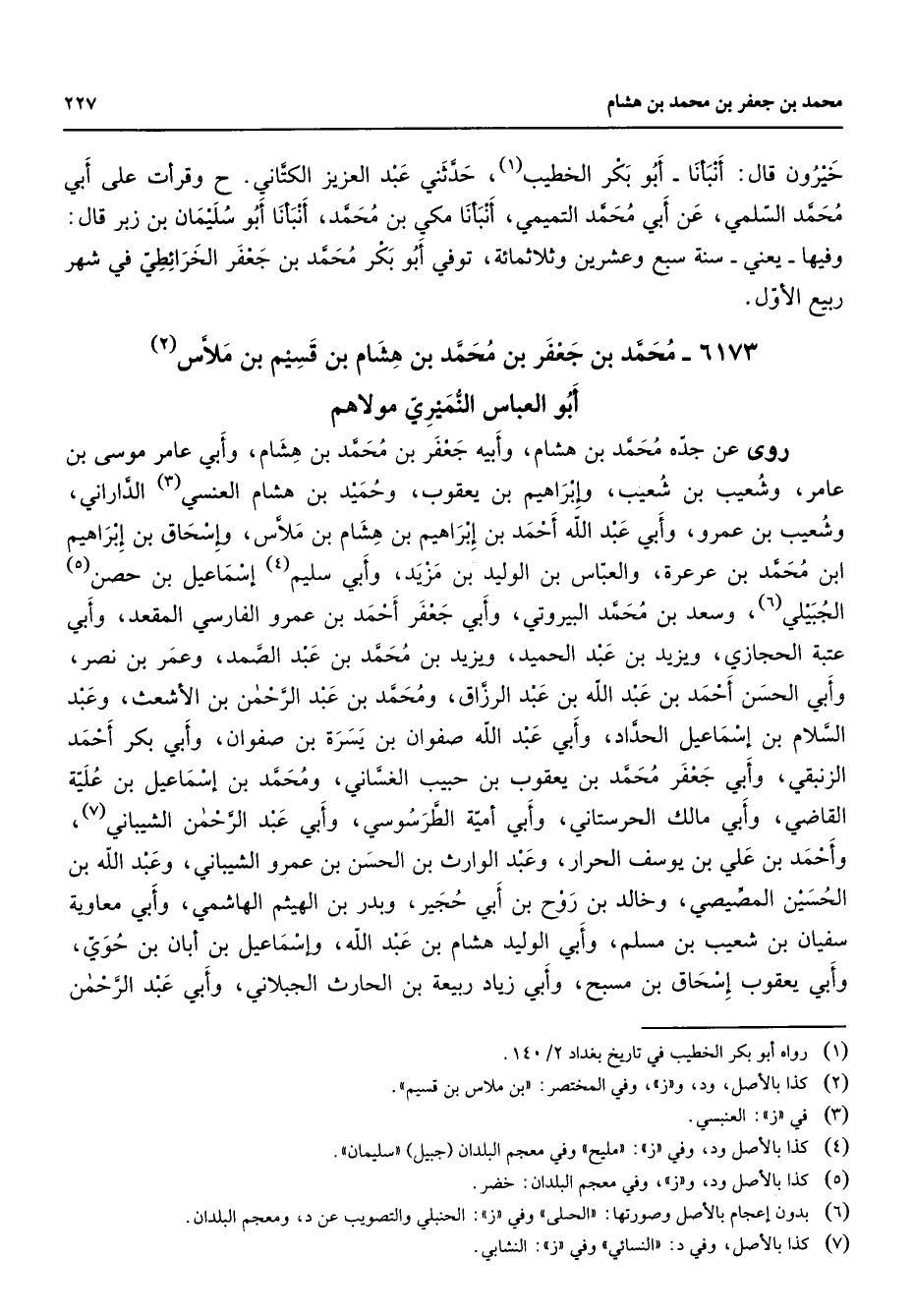 6173 - محمد بن جعفر بن محمد بن هشام بن قسيم بن ملاس (2) أبو العباس النميري مولاهم روى عن جده محمد بن هشام وأبيه جعفر بن محمد بن هشام وأبي عامر موسى بن عامر وشعيب بن شعيب وإبراهيم بن يعقوب وحميد بن هشام العنسي (3) الداراني وشعيب بن عمرو وأبي عبد الله أحمد بن إبراهيم بن هشام بن ملاس وإسحاق بن إبراهيم ابن محمد بن عرعرة والعباس بن الوليد بن مزيد وأبي سليم (4) إسماعيل بن حصن (5) الجبيلي (6) وسعد بن محمد البيروتي وأبي جعفر احمد بن عمرو الفارسي المقعد وأبي عتبة الحجازي ويزيد بن عبد الحميد ويزيد بن محمد بن عبد الصمد وعمر بن نصر وأبي الحسن أحمد بن عبد الله بن عبد الرزاق ومحمد بن عبد الرحمن بن الأشعث وعبد السلام بن إسماعيل الحداد وأبي عبد الله صفوان بن يسره بن صفوان وأبي بكر أحمد الزنبقي وأبي جعفر محمد بن يعقوب بن حبيب الغساني ومحمد بن إسماعيل بن علية القاضي وأبي مالك الحرستاني وأبي امية الطرسوسي وأبي عبد الرحمن الشيباني (7) وأحمد بن علي بن يوسف الحرار وعبد الوارث بن الحسن بن عمرو الشيباني وعبد الله بن الحسين المصيصي وخالد بن روح بن ابي حجير وبدر بن الهيثم الهاشمي وابي معاوية سفيان بن شعيب بن مسلم وأبي الوليد هشام بن عبد الله وإسماعيل بن أبان بن حوي وأبي يعقوب إسحاق بن مسبح وأبي زياد ربيعة بن الحارث الجبلاني وأبي عبد الرحمن