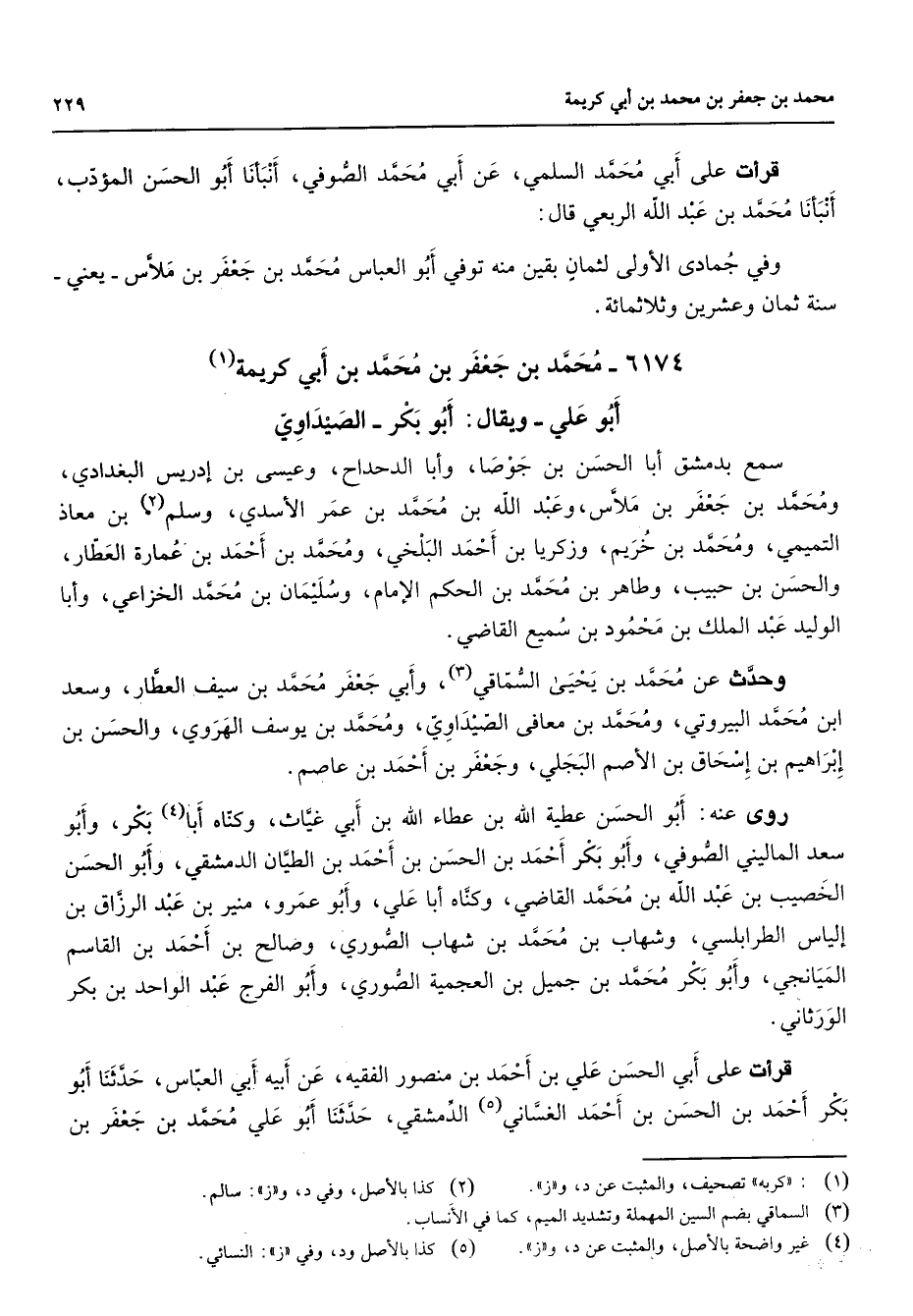 6174 - محمد بن جعفر بن محمد بن ابي كريمة (1) أبو علي ويقال أبو بكر الصيداوي سمع بدمشق أبا الحسن بن جوصا وأبا الدحداح وعيسى بن إدريس البغدادي ومحمد بن جعفر بن ملاس وعبد الله بن محمد بن عمر الأسدي وسلم (2) بن معاذ التميمي ومحمد بن خريم وزكريا بن أحمد البلخي ومحمد بن أحمد بن عمارة العطار والحسن بن حبيب وطاهر بن محمد بن الحكم الإمام وسليمان بن محمد الخزاعي وأبا الوليد عبد الملك بن محمود بن سميع القاضي وحدث عن محمد بن يحيى السماقي (3) وأبي جعفر محمد بن سيف العطار وسعد ابن محمد البيروتي ومحمد بن معافى الصيداوي ومحمد بن يوسف الهروي والحسن بن إبراهيم بن إسحاق بن الأصم البجلي وجعفر بن أحمد بن عاصم روى عنه أبو الحسن عطية الله بن عطاء الله بن أبي غياث وكناه أبا (4) بكر وابو سعد الماليني الصوفي وأبو بكر أحمد بن الحسن بن أحمد بن الطيان الدمشقي وابو الحسن الخصيب بن عبد الله بن محمد القاضي وكناه ابا علي وأبو عمرو منير بن عبد الرزاق بن إلياس الطرابلسي وشهاب بن محمد بن شهاب الصوري وصالح بن أحمد بن القاسم الميانجي وأبو بكر محمد بن جميل بن العجمية الصوري وأبو الفرج عبد الواحد بن بكر الورثاني قرأت علي أبي الحسن علي بن أحمد بن منصور الفقية عن أبيه أبي العباس حدثنا أبو بكر أحمد بن الحسن بن أحمد الغساني (5) الدمشقي حدثنا أبو علي محمد بن جعفر بن