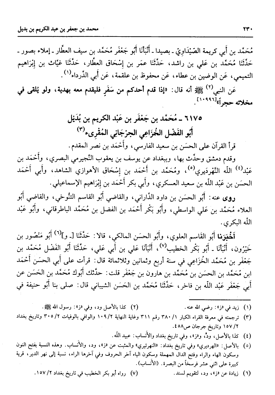 [10996] 6175 محمد بن جعفر بن عبد الكريم بن بديل أبو الفضل الخزاعي الجرجاني المقرئ (3) قرأ القرآن على الحسن بن سعيد الفارسي وأحمد بن نصر المقدم وقدم دمشق وحدث بها وببغداد عن يوسف بن يعقوب النجيرمي البصري وأحمد بن عبد (4) الله النهرديري (5) ومحمد بن أحمد بن إسحاق الأهوازي الشاهد وأبي أحمد الحسن بن عبد الله بن سعيد العسكري وابي بكر أحمد بن إبراهيم الإسماعيلي روى عنه أبو الحسن بن داود الداراني والقاضي أبو القاسم التنوخي والقاضي أبو العلاء محمد بن علي الواسطي وأبو بكر أحمد بن الفضل بن محمد الباطرقاني وابو عبد الله البكري أخبرنا أبو القاسم العلوي وأبو الحسن المالكي قالا حدثنا و (6) أبو منصور بن خيرون أنبأنا أبو بكر الخطيب (7) أنبأنا علي بن أبي علي حدثنا أبو الفضل محمد بن جعفر بن محمد الخزاعي في سنة أربع وثمانين وثلاثمائة قال قرأت على أبي الحسن أحمد ابن محمد بن الحسن بن محمد بن هارون بن جعفر قلت حدثك أبوك محمد بن الحسن عن أبي جعفر عبد الله بن فاخر حدثنا محمد بن الحسن الشيباني قال صلى بنا أبو حنيفة في