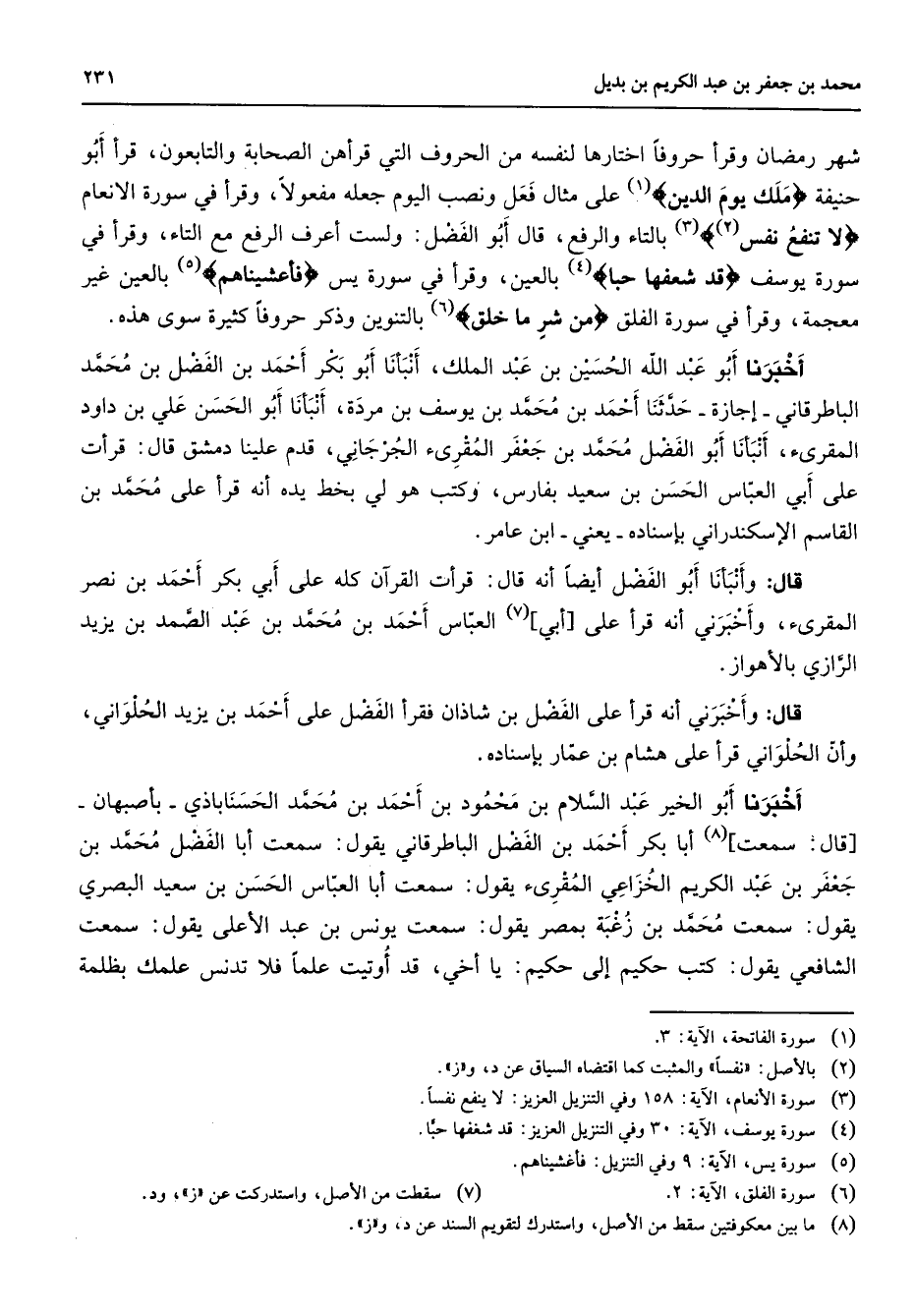 شهر رمضان وقرأ حروفا أختارها لنفسه من الحروف التي قرأهن الصحابة والتابعون قرأ أبو حنيفة " ملك يوم الدين " (1) على مثال فعل ونصب اليوم جعله مفعولا وقرأ في سورة الأنعام " لا تنفع نفس (2) " (3) بالتاء والرفع قال أبو الفضل ولست أعرف الرفع مع التاء وقرأ في سورة يوسف " قد شغفها حبا " (4) بالعين وقرأ في سورة يس " فأعشيناهم " (5) بالعين غير معجمة وقرأ في سورة الفلق " من شر ما خلق " (6) بالتنوين وذكر حروفا كثيرة سوة هذه أخبرنا أبو عبد الله الحسين بن عبد الملك أنبأنا أبو بكر أحمد بن الفضل بن محمد الباطرقاني أجازة حدثنا أحمد بن محمد بن يوسف بن مردة أنبأنا أبو الحسن علي بن داود المقرئ أنبأنا أبو الفضل محمد بن جعفر المقرئ الجرجاني قدم علينا دمشق قال قرأت على أبي العباس الحسن بن سعيد بفارس وكتب وهو لي بخط يده أنه قرأ على محمد بن القاسم الإسكندراني بإسناده يعني ابن عامر قال وأنبأنا أبو الفضل أيضا أنه قال قرأت القرآن كله على أبي بكر أحمد بن نصر المقرئ وأخبرني أنه قرأ علي أبي (7) العباس أحمد بن محمد بن عبد الصمد بن يزيد الرازي بالأهواز قال وأخبرني أنه قرأ على الفضل بن شاذان فقرأ الفضل على أحمد بن يزيد الحلواني وان الحلواني قرأ على هشام بن عمار بإسناده أخبرنا أبو الخير عبد السلام بن محمود بن أحمد بن محمد الحسناباذي بأصبهان قال سمعت (8) أبا بكر أحمد بن الفضل الباطرقاني يقول سمعت أبا الفضل محمد بن جعفر بن عبد الكريم الخزاعي المقرئ يقول سمعت أبا العباس الحسن بن سعيد البصري يقول سمعت محمد بن زغبة بمصر يقول سمعت يونس بن عبد الأعلى يقول سمعت ي يقول كتب حكيم إلى حكيم يا أخي قد أوتيت علما فلا تدنس علمك بظلمة