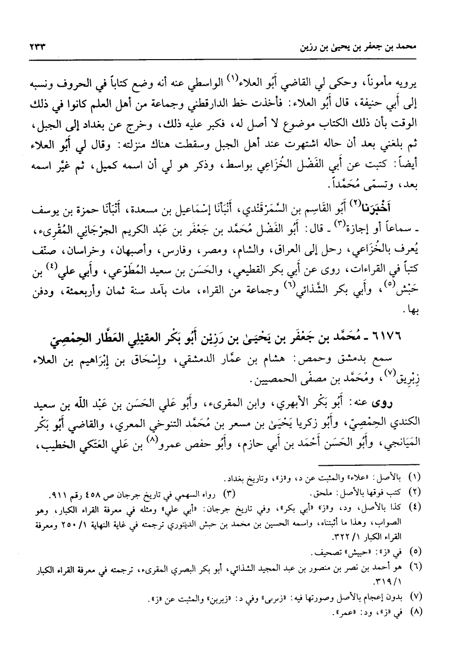 (4) كذا بالاصل ود و " ز " " أبي بكر " وفي تاريخ جرجان: " أبي علي " ومثله في معرفة القراء الكبار وهو الصواب وهذا ما أثبتناه واسمه الحسين بن محمد بن حبش الدينوري ترجمته في غاية النهاية 1 / 250 ومعرفة القراء الكبار 1 / 322