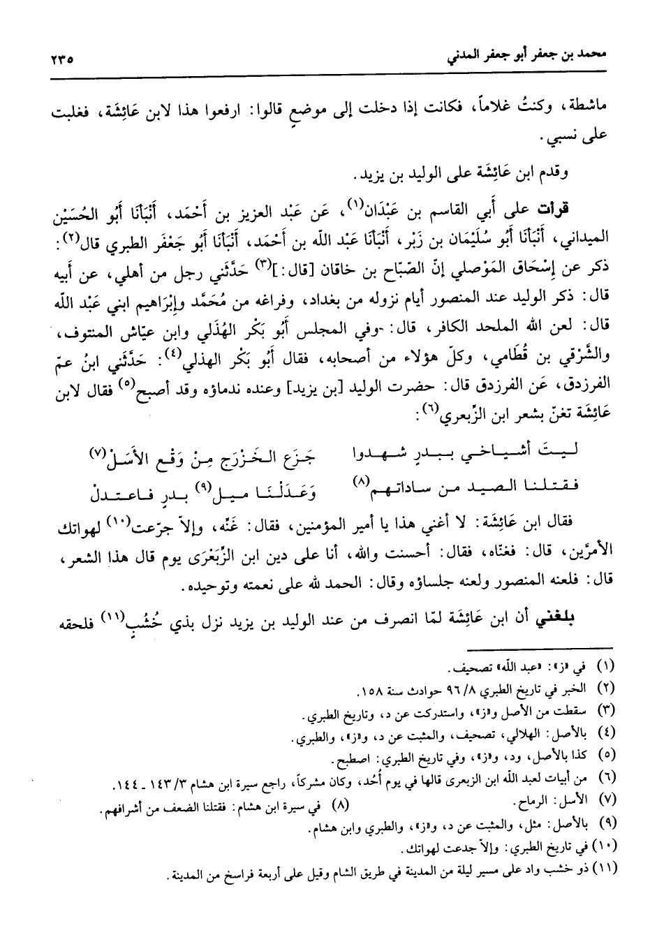 ما شطة وكنت غلاما فكانت إذا دخلت إلى موضع قالوا ارفعوا هذا لأبن عائشة فغلبت على نسبي وقدم ابن عائشة على الوليد بن يزيد قرأت على ابي القاسم بن عبدان (1) عن عبد العزيز بن أحمد أنبأنا أبو الحسين الميداني أنبأنا أبو سليمان بن زبر أنبأنا عبد الله بن أحمد أنبأنا أبو جعفر الطبري قال (2) ذكر عن إسحاق الموصلي إن الصباح بن خاقان قال (3) حدثني رجل من اهلي عن ابيه قال ذكر الوليد عند المنصور أيام نزوله من بغداد وفراغه من محمد وإبراهيم ابني عبد الله قال لعن الله الملحد الكافر قال وفي المجلس أبو بكر الهذلي وابن عياش المنتوف والشرقي بن قطامي وكل هؤلاء من أصحابه فقال أبو بكر الهذلي (4) حدثني أبن عم الفرزدق عن الفرزدق قال حضرت الوليد بن يزيد وعنده ندماؤه وقد أصبح (5) فقال لابن عائشة تغن بشعر ابن الزبعري (6) * ليت أشياخي ببدر شهدوا * جزع الخزرج من وقع الأسل (7) فقتلنا الصيد من ساداتهم (8) * وعدلنا ميل (9) بدر فاعتدل * فقال ابن عائشة لا أغني هذا يا أمير المؤمنين فقال غنه وإلا جرعت (10) لهواتك الأمرين قال فغناه فقال أحسنت والله أنا علي دين ابن الزبعرى يوم قال هذا الشعر قال فلعنه المنصور ولعنه جلساؤه وقال الحمد لله على نعمته وتوحيده بلغني أن ابن عائشة لما انصرف من عند الوليد بن يزيد نزل بذي خشب (11)