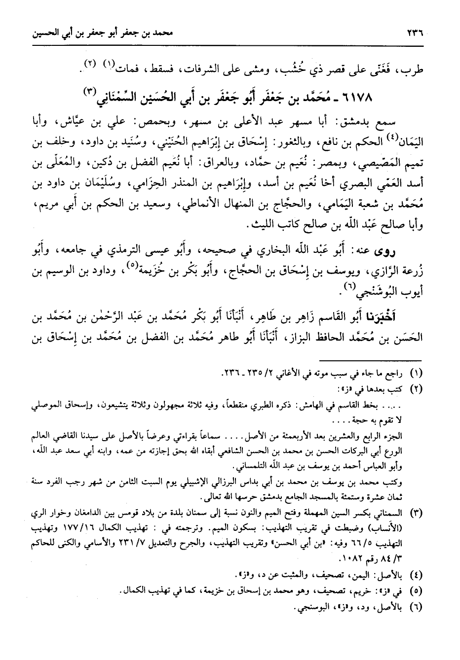6178 - محمد بن جعفر أبو جعفر بن ابي الحسين السمناني (3) سمع بدمشق أبا مسهر عبد الأعلى بن مسهر وبحمص علي بن عياش وأبا اليمان (4) الحكم بن نافع وبالثغور إسحاق بن إبراهيم الحنيني وسنيد بن داود وخلف بن تميم المصيصي وبمصر نعيم بن حماد وبالعراق أبا نعيم الفضل بن دكين والمعلى بن أسد العمي البصري أخا نعيم بن أسد وإبرهيم بن المنذر الحزمي وسليمان بن داود بن محمد بن شعبة اليمامي والحجاج بن المنهال الأنماطي وسعيد بن الحكم بن أبي مريم وأبا صالح عبد الله بن صالح كاتب الليث روى عنه أبو عبد الله البخاري في صحيحه وأبو عيسى الترمذي في جامعة وأبو زرعة الرازي ويوسف بن إسحاق بن الحجاج وأبو بكر بن خزيمة (5) وداود بن الوسيم بن أيوب البوشنجي (6) أخبرنا أبو القاسم زاهر بن طاهر أنبأنا أبو بكر محمد بن عبد الرحمن بن محمد بن الحسن بن محمد الحافظ البزاز أنبأنا أبو طاهر محمد بن الفضل بن محمد بن إسحاق بن