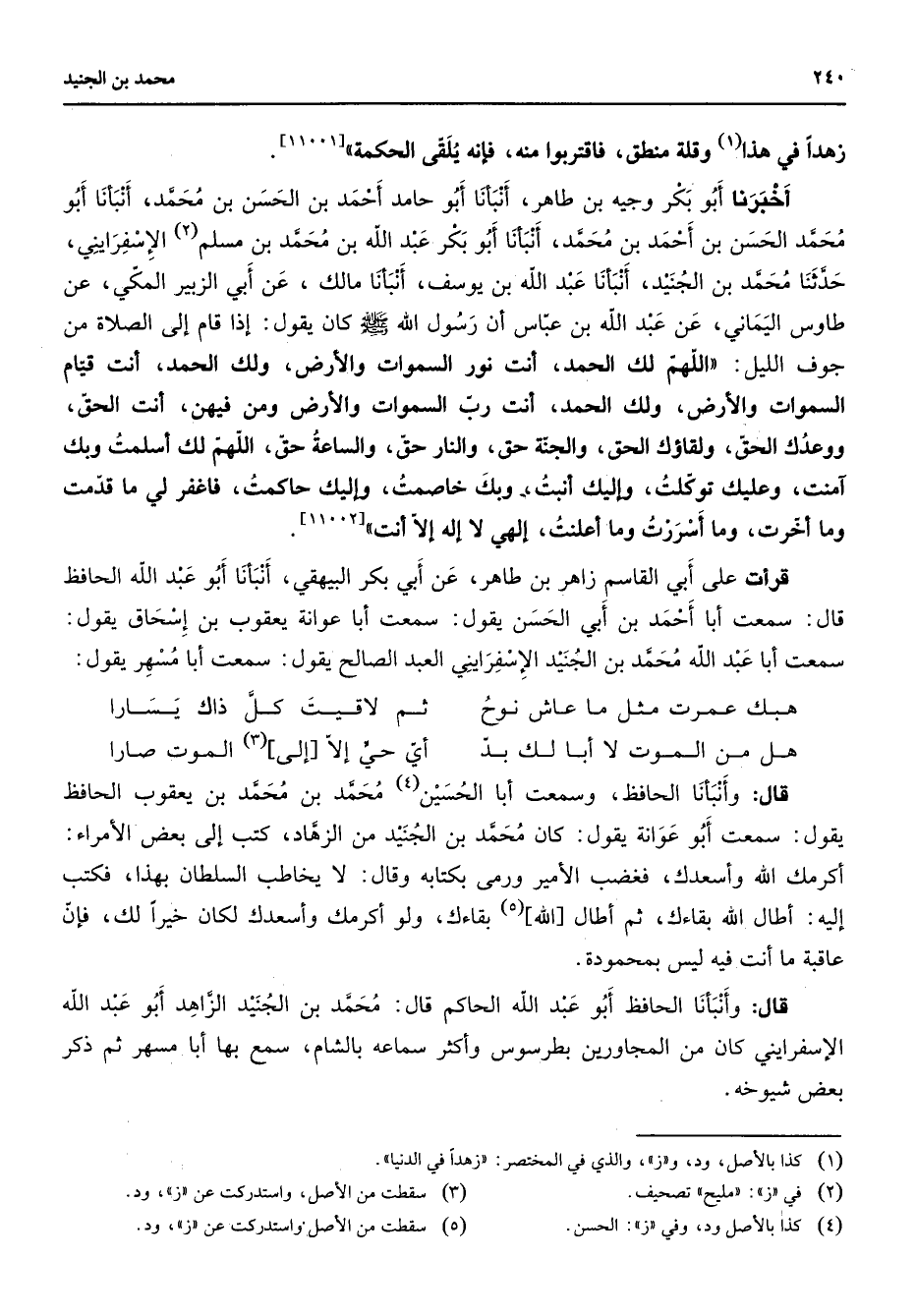 [11002] قرأت على أبي القاسم زاهر بن طاهر عن أبي بكر البيهقي أنبأنا أبو عبد الله الحافظ قال سمعت أبا أحمد بن أبي الحسن يقول سمعت أبا عوانة يعقوب بن إسحاق يقول سمعت أبا عبد الله محمد بن الجنيد الإسفرايني العبد الصالح يقول سمعت أبا مسهر يقول * هبك عمرت مثل ما عاش نوح * ثم لاقيت كل ذاك يسارا * هل من الموت لا أبا لك بد * أي حي إلا إلى (3) الموت صارا * قال وأنبأنا الحافظ وسمعت أبا الحسين (4) محمد بن محمد بن يعقوب الحافظ يقول سمعت أبو عوانة يقول كان محمد بن الجنيد من الزهاد كتب إلى بعض الأمراء أكرمك الله وأسعدك فغضب الأمير ورمى بكتابه وقال لا يخاطب السلطان بهذا فكتب إليه أطال الله بقاءك ثم أطال الله (5) بقاءك ولو أكرمك وأسعدك لكان خيرا لك فإن عاقبة ما أنت فيه ليس بمحموده قال وأنبأنا الحافظ أبو عبد الله الحاكم قال محمد بن الجنيد الزاهد أبو عبد الله الأسفرايني كان من المجاورين بطرسوس وأكثر سماعة بالشام سمع بها أبا مسهر ثم ذكر بعض شيوخه