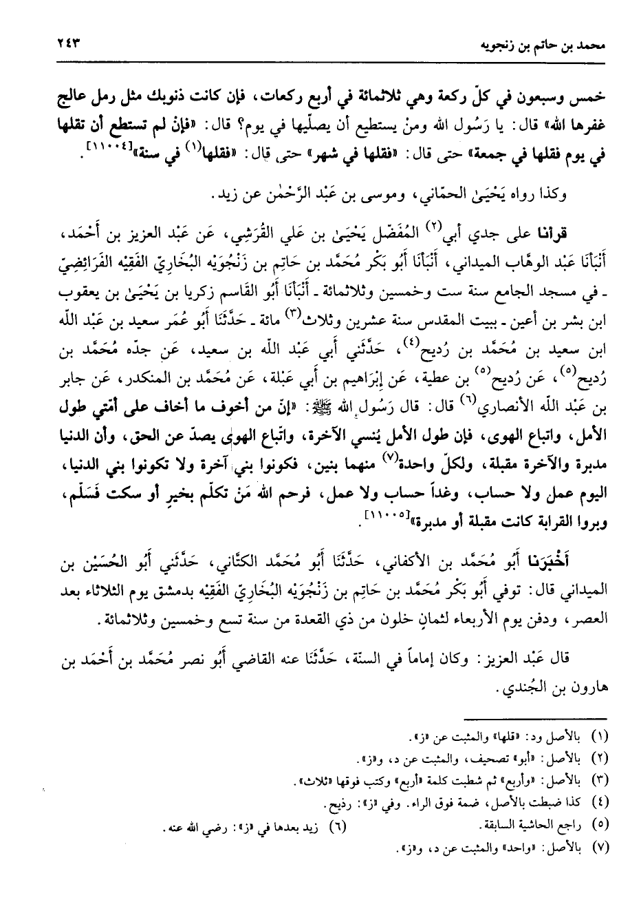 [11005] أخبرنا أبو محمد بن الأكفاني حدثنا أبو محمد الكتاني حدثني أبو الحسين بن الميداني قال توفي أبو بكر محمد بن حاتم بن زنجوية البخاري الفقية بدمشق يوم الثلاثاء بعد العصر ودفن يوم الأربعاء لثمان خلون من ذي القعدة من سنة تسع وخمسين وثلاثمائة قال عبد العزيز وكان إماما في السنة حدثنا عنه القاضي أبو نصر محمد بن أحمد بن هارون بن الجندي