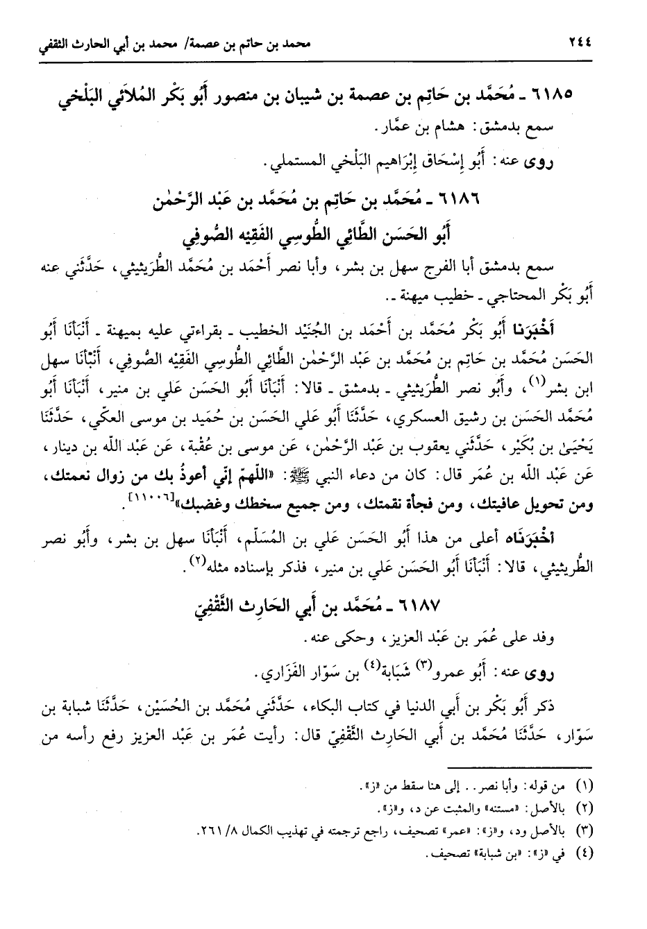 6186 - محمد بن حاتم بن محمد بن عبد الرحمن أبو الحسن الطائي الطوسي الفقية الصوفي سمع بدمشق أبا الفرج سهل بن بشر وأبا نصر أحمد بن محمد الطريثيثي حدثني عنه أبو بكر المحتاجي حطيب ميهنة أخبرنا أبو بكر محمد بن أحمد بن الجنيد الخطيب بقراءتي عليه بميهنة أنبأنا أبو الحسن محمد بن حاتم بن محمد بن عبد الرحمن الطائي الطوسي الفقية الصوفي أنبأنا سهل ابن بشر (1) وأبو نصر الطريثيثي بدمشق قالا أنبأنا أبو الحسن علي بن منير أنبأنا أبو محمد الحسن بن رشيق العسكري حدثنا أبو علي الحسن بن حميد بن موسى العكي حدثنا يحيى بن بكير حدثني يعقوب بن عبد الرحمن عن موسى بن عقبة عن عبد الله بن دينار عن عبد الله بن عمر قال كان من دعاء النبي (صلى الله عليه وسلم) اللهم إني أعوذ بك من زوال نعمتك ومن تحويل عافيتك ومن فجأة نقمتك ومن جميع سخطك وغضبك