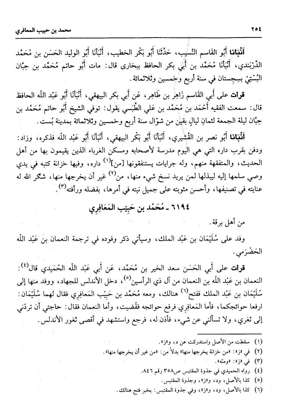 6194 - محمد بن حبيب المعافري من أهل برقة وفد على سليمان بن عبد الملك وسيأتي ذكر وفوده في ترجمة النعمان بن عبد الله الحضرمي قرأت علي أبي الحسن سعد الخير بن محمد عن أبي عبد الله الحميدي قال (4) النعمان بن عبد الله بن النعمان من آل ذي الرأسين (5) دخل الأندلس للجهاد ووفد منها إلى سليمان بن عبد الملك ففتح (6) هنالك ومعه محمد بن حبيب المعافري فقال لهما سليمان ارفعا حوائجكما فأما المعافري فرفع حوائجه فقضيت وأما النعمان فقال حاجتي أن تردني إلى ثغري ولا تسألني عن شئ فإذن له فرجع واستشهد في أقصى ثغور الأندلس