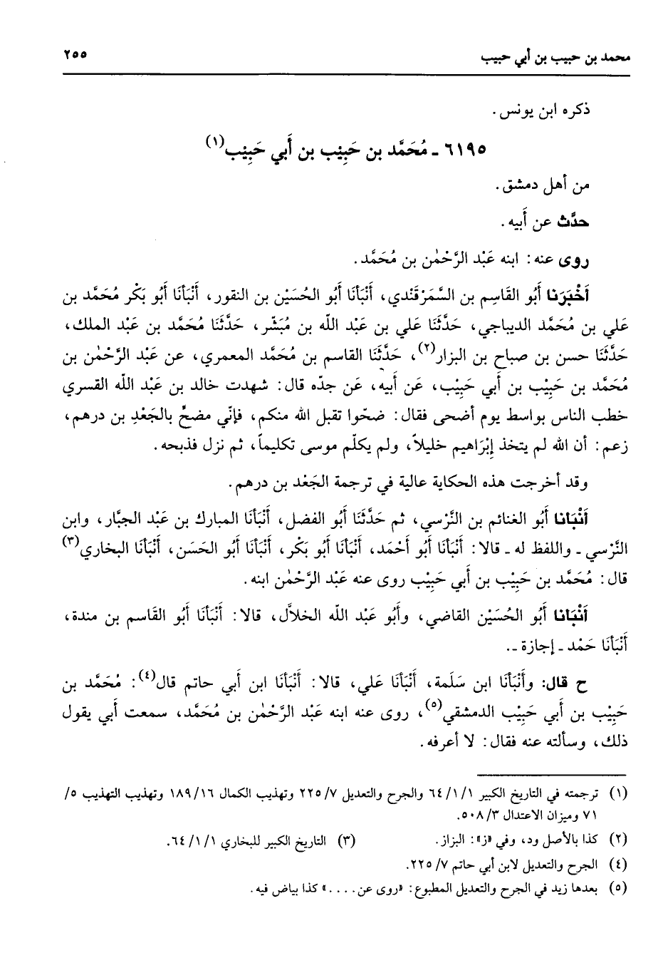 6195 - محمد بن حبيب بن أبي حبيب (1) من أهل دمشق حدث عن أبيه روى عنه ابنه عبد الرحمن بن محمد أخبرنا أبو القاسم بن السمرقندي أنبأنا أبو الحسين بن النقور أنبأنا أبو بكر محمد بن علي بن محمد الديباجي حدثنا علي بن عبد الله بن مبشر محمد بن عبد الملك حدثنا حسن بن صباح بن البزار (2) حدثنا القاسم بن محمد المعمري عن عبد الرحمن بن محمد بن حبيب بن أبي حبيب عن أبيه عن جده قال شهدت خالد بن عبد الله القسري خطب الناس بواسط يوم أضحى فقال ضحوا تقبل الله منكم فإني مضح بالجعد بن درهم زعم أن الله لم يتخذ إبراهيم خليلا ولم يكلم موسى تكليما ثم نزل فذبحه وقد أخرجت هذه الحكاية عالية في ترجمة الجعد بن درهم أنبأنا أبو الغنائم بن النرسي ثم حدثنا أبو الفضل أنبأنا المبارك بن عبد الجبار وابن النرسي واللفظ له قالا أنبأنا أبو أحمد أنبأنا أبو بكر أنبأنا أبو الحسن أنبأنا البخاري (3) قال محمد بن حبيب بن أبي حبيب روى عنه عبد الرحمن ابنه أنبأنا أبو الحسين القاضي وأبو عبد الله الخلال قالا أنبأنا أبو القاسم بن مندة أنبأنا حمد إجازة ح قال وأنبأنا ابن سلمة أنبأنا علي قالا أنبأنا ابن أبي حاتم قال (4) محمد بن حبيب بن أبي حبيب الدمشقي (5) روى عنه ابنه عبد الرحمن بن محمد سمعت ابي يقول ذلك وسألته عنه فقال لا أعرفه