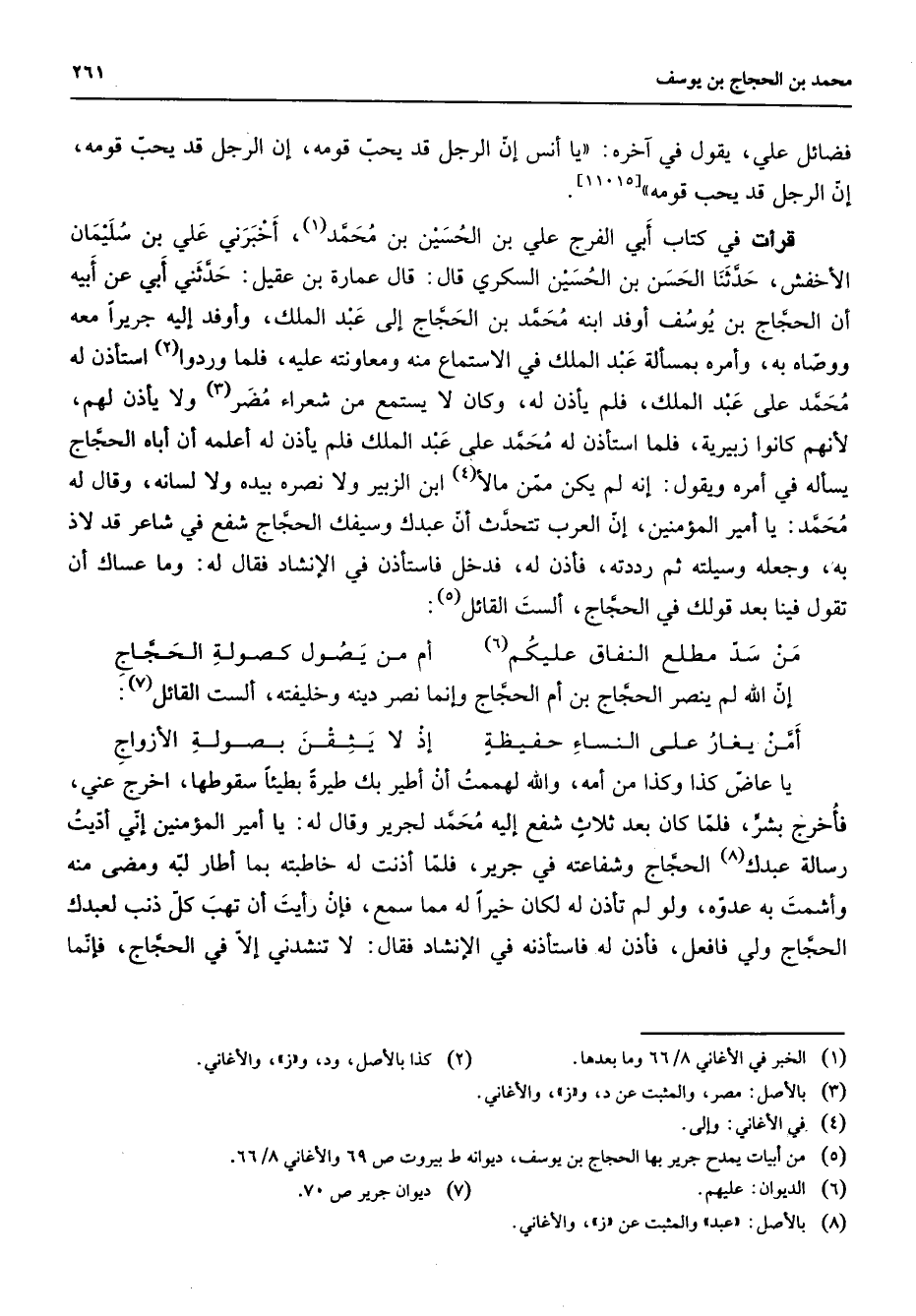 (5) من أبيات يمدح جرير بها الحجاج بن يوسف ديوانه ط بيروت ص 69 والاغاني 8 / 66