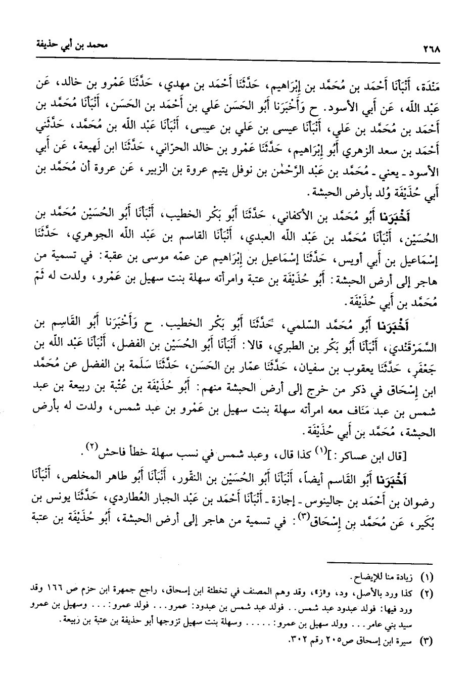 مندة أنبأنا أحمد بن محمد بن إبراهيم حدثنا أحمد بن مهدي حدثنا عمرو بن خالد عن عبد الله عن أبي الأسود وأخبرنا أبو الحسن علي بن احمد بن الحسن أنبأنا محمد بن أحمد بن محمد بن علي أنبأنا عيسى بن علي بن عيسى أنبأنا عبد الله بن محمد حدثني احمد بن سعد الزهري أبو إبراهيم حدثنا عمرو بن خالد الحراني حدثنا ابن لهيعة عن أبي الأسود يعني محمد بن عبد الرحمن بن نوفل يتيم عروة بن الزبير عن عروة أن محمد بن أبي حذيفة ولد بأرض الحبشة أخبرنا أبو محمد بن الأكفاني حدثنا أبو بكر الخطيب أنبأنا أبو الحسين محمد بن الحسين أنبأنا محمد بن عبد الله العبدي أنبأنا القاسم بن عبد الله الجوهري حدثنا إسماعيل بن أبي اويس حدثنا إسماعيل بن إبراهيم عن عمه موسى بن عقبة في تسمية من هاجر إلى أرض الحبشة أبو حذيفة بن عتبة وامرأته سهلة بنت سهيل بن عمرو ولدت له ثم محمد بن أبي حذيفة أخبرنا أبو محمد السلمي حدثنا أبو بكر الخطيب وأخبرنا أبو القاسم بن السمرقندي أنبأنا أبو بكر بن الطبري قالا أنبأنا أبو الحسين بن الفضل أنبأنا عبد الله بن جعفر حدثنا يعقوب بن سفيان حدثنا عمار بن الحسن حدثنا سلمة بن الفضل عن محمد ابن إسحاق في ذكر من خرج إلى أرض الحبشة منهم أبو حذيفة بن عتبة بن ربيعة بن عبد شمس بن عبد مناف معه امرأته سهلة بنت سهيل بن عمرو بن عبد شمس ولدت له بأرض الحبشة محمد بن أبي حذيفة قال ابن عساكر (1) كذا قال وعبد شمس في نسب سهلة خطأ فاحش (2) أخبرنا أبو القاسم أيضا أنبأنا أبو الحسين بن النقور أنبأنا أبو طاهر المخلص أنبأنا رضوان بن أحمد بن جالينوس إجازة أنبأنا أحمد بن عبد الجبار العطاردي حدثنا يونس بن بكير عن محمد بن إسحاق (3) في تسمية من هاجر إلى أرض الحبشة أبو حذيفة بن عتبة