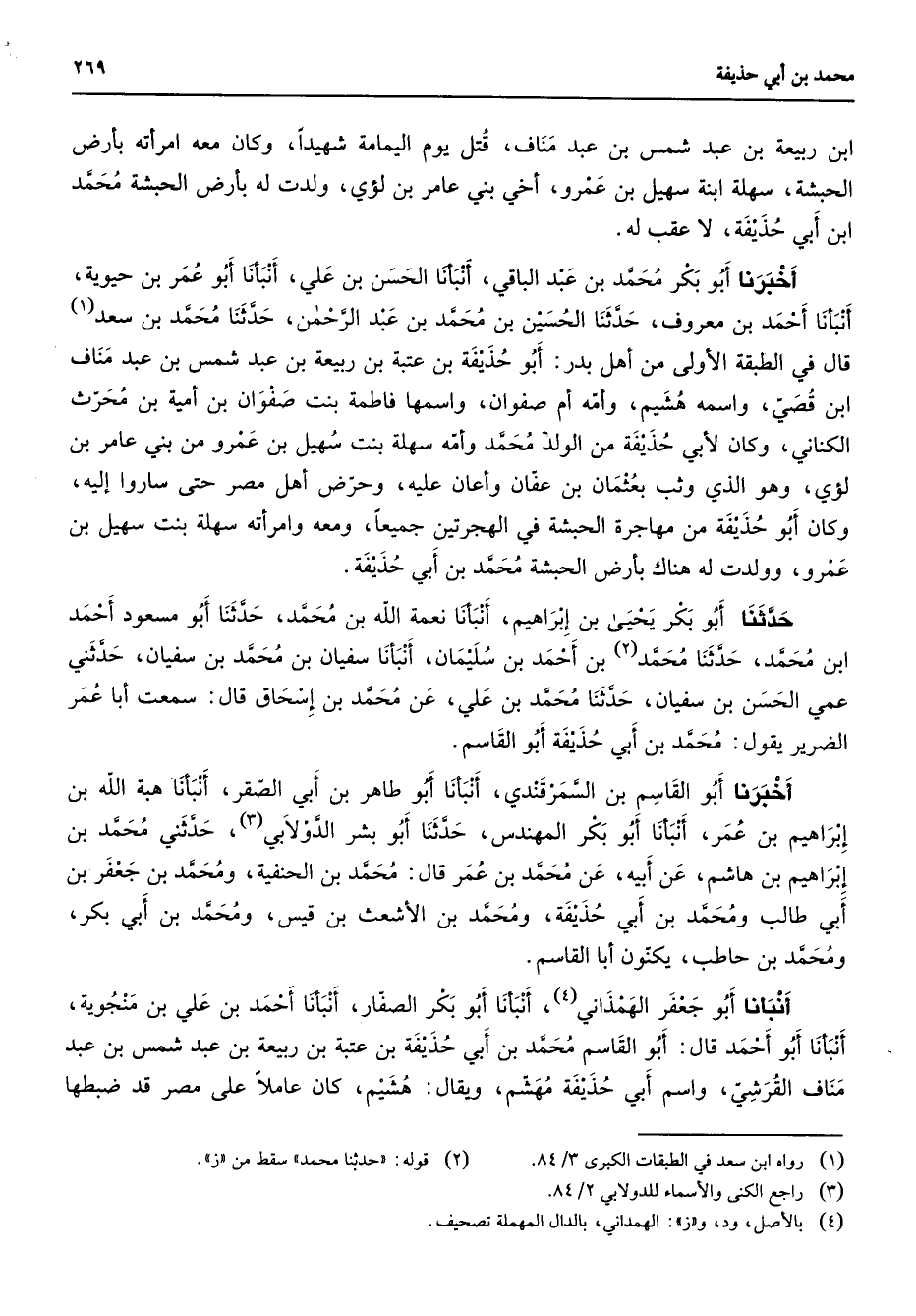 ابن ربيعة بن عبد شمس بن عبد مناف قتل يوم اليمامة شهيدا وكان معه امرأته بأرض الحبشة سهلة ابنة سهيل بن عمرو أخي بني عامر بن لؤي ولدت له بأرض الحبشة محمد ابن أبي حذيفة لا عقب له أخبرنا أبو بكر محمد بن عبد الباقي أنبأنا الحسن بن علي أنبأنا أبو عمر بن حيوية أنبأنا أحمد بن معروف حدثنا الحسين بن محمد بن عبد الرحمن حدثنا محمد بن سعد (1) قال في الطبقة الاولى من أهل بدر أبو حذيفة بن عتبة بن ربيعة بن عبد شمس بن عبد مناف ابن قصي واسمه هشيم وأمة أم صفوان واسمها فاطمة بنت صفوان بن أمية بن محرث الكناني وكان لأبي حذيفة من الولد محمد وأمه سهلة بنت سهيل بن عمرو من بني عامر بن لؤي وهو الذي وثب بعثمان بن عفان وأعان عليه وحرض أهل مصر حتى ساروا إليه وكان أبو حذيفة من مهاجرة الحبشة في الهجرتين جميعا ومعه وامرأته سهلة بنت سهيل بن عمرو وولدت له هناك بأرض الحبشة محمد بن أبي حذيفة حدثنا أبو بكر يحيى بن إبراهيم أنبأنا نعمة الله بن محمد حدثنا أبو مسعود أحمد ابن محمد حدثنا محمد (2) بن أحمد بن سليمان أنبأنا سفيان بن محمد بن سفيان حدثني عمي الحسن بن سفيان حدثنا محمد بن علي عن محمد بن إسحاق قال سمعت أبا عمر الضرير يقول محمد بن أبي حذيفة أبو القاسم أخبرنا أبو القاسم بن السمرقندي أنبأنا أبو طاهر بن أبي الصقر أنبأنا هبة الله بن إبراهيم بن عمر أنبأنا أبو بكر المهندس حدثنا أبو بشر الدولابي (3) حدثني محمد بن إبراهيم بن هاشم عن أبيه عن محمد بن عمر قال محمد بن الحنفية ومحمد بن جعفر بن أبي طالب ومحمد بن أبي حذيفة ومحمد بن الأشعث بن قيس ومحمد بن ابي بكر ومحمد بن حاطب يكنون أبا القاسم أنبأنا أبو جعفر الهمذاني (4) أنبأنا أبو بكر الصفار أنبأنا أحمد بن علي بن منجوية أنبأنا أبو أحمد قال أبو القاسم محمد بن ابي حذيفة بن عتبة بن ربيعة بن عبد شمس بن عبد مناف القرشي واسم أبي حذيفة مهشم ويقال هشيم كان عاملا على مصر قد ضبطها