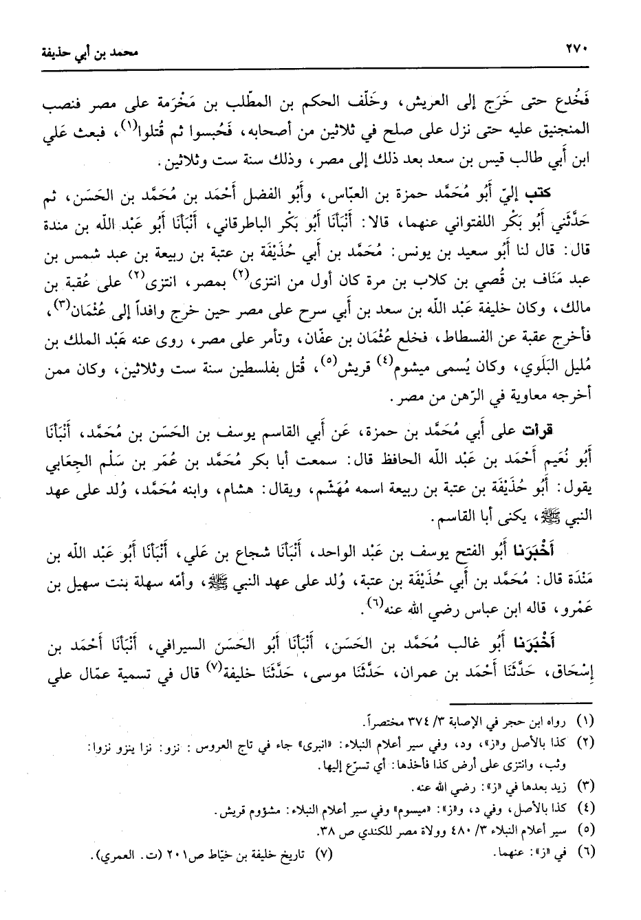 فخدع حتى خرج إلى العريش وخلف الحكم بن المطلب بن مخرمة على مصر فنصب المنجنيق عليه حتى نزل على صلح في ثلاثين من أصحابه فحبسوا ثم قتلوا (1) فبعث علي ابن ابي طالب قيس بن سعد بعد ذلك إلى مصر وذلك سنة ست وثلاثين كتب إلي أبو محمد حمزة بن العباس وأبو الفضل أحمد بن محمد بن الحسن ثم حدثني أبو بكر اللفتواني عنهما قالا أنبأنا أبو بكر الباطرقاني أنبأنا أبو عبد الله بن مندة قال قال لنا أبو سعيد بن يونس محمد بن أبي حذيفة بن عتبة بن ربيعة بن عبد شمس بن عبد مناف بن قصي بن كلاب بن مرة كان أول من أنتزى (2) بمصر انتزى (2) على عقبة بن مالك وكان خليفة عبد الله بن سعد بنأبي سرح على مصر حين خرج وافدا إلى عثمان (3) فاخرج عقبة عن الفسطاط فخلع عثمان بن عفان وتأمر على مصر روى عنه عبد الملك بن مليل البلوي وكان يسمى ميشوم (4) قريش (5) قتل بفلسطين سنة ست وثلاثين وكان ممن أخرجه معاوية في الرهن من مصر قرأت على أبي محمد بن حمزة عن أبي القاسم يوسف بن الحسن بن محمد أنبأنا أبو نعيم أحمد بن عبد الله الحافظ قال سمعت أبا بكر محمد بن عمر بن سلم الجعابي يقول أبو حذيفة بن عتبة بن ربيعة اسمه مهشم ويقال هشام وابنه محمد ولد على عهد النبي (صلى الله عليه وسلم) يكنى أبا القاسم أخبرنا أبو الفتح يوسف بن عبد الواحد أنبأنا شجاع بن علي أنبأنا أبو عبد الله بن مندة قال محمد بن أبي حذيفة بن عتبة ولد على عهد النبي (صلى الله عليه وسلم) وأمه سهلة بنت سهيل بن عمرو قاله ابن عباس Bهـ (6) اخبرنا أبو غالب محمد بن الحسن أنبأنا أبو الحسن السيراقي أنبأنا أحمد بن إسحاق حدثنا أحمد بن عمران حدثنا موسى حدثنا خليفة قال في تسمية عمال علي
