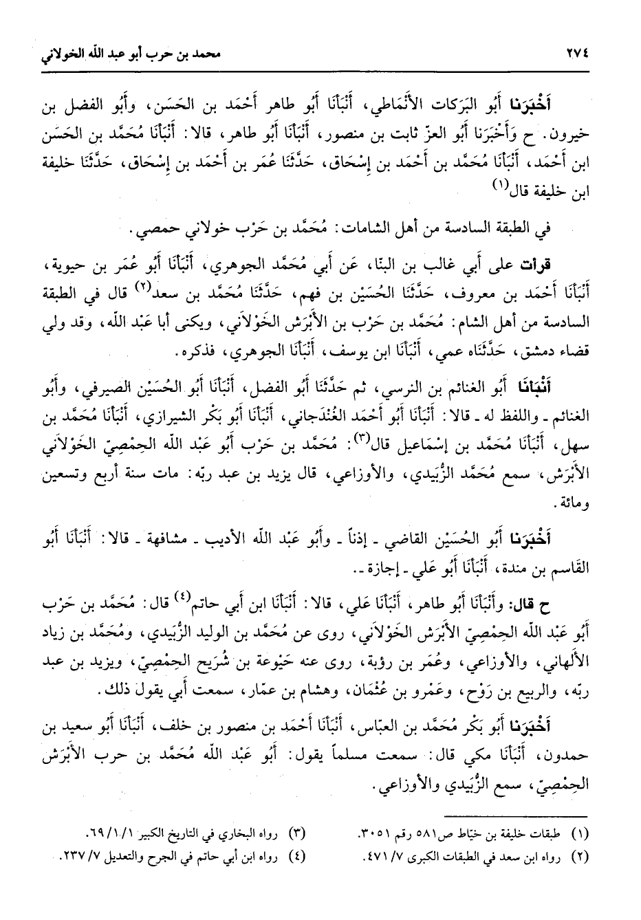 أخبرنا أبو البركات الأنماطي أبو طاهر أحمد بن الحسن وأبو الفضل بن خيرون وأخبرنا أبو العز ثابت بن منصور أنبأنا أبو طاهر قالا أنبأنا محمد بن الحسن ابن أحمد أنبأنا محمد بن أحمد بن إسحاق حدثنا عمر بن أحمد بن إسحاق حدثنا خليفة ابن خليفة قال (1) في الطبقة السادسة من أهل الشامات محمد بن حرب خولاني حمصي قرأت على أبي غالب بن البنا عن أبي محمد الجوهري أنبأنا أبو عمر بن حيوية أنبأنا أحمد بن معروف حدثنا الحسين بن فهم حدثنا محمد بن سعد (2) قال في الطبقة السادسة من أهل الشام محمد بن حرب بن الأبرش الخولاني ويكنى أبا عبد الله وقد ولي قضاء دمشق حدثناه عمي أنبأنا ابن يوسف أنبأنا الجوهري فذكره أنبأنا أبو الغنائم بن النرسي ثم حدثنا أبو الفضل أنبأنا أبو الحسين الصيرفي وابو الغنائم واللفظ له قالا أنبأنا أبو أحمد الغندجاني أنبأنا أبو بكر الشيرازي أنبأنا محمد بن سهل أنبأنا محمد بن إسماعيل قال (3) محمد بن حرب أبو عبد الله الحمصي الخولاني الأبرش سمع محمد الزبيدي والأوزاعي قال يزيد بن عبد ربه مات سنة أربع وتسعين ومائة أخبرنا أبو الحسين القاضي إذنا وأبو عبد الله الأديب مشافهة قالا أنبأنا أبو القاسم بن مندة أنبأنا أبو علي إجازة ح قال وأنبأنا أبو طاهر أنبأنا علي قالا أنبأنا ابن أبي حاتم (4) قال محمد بن حرب أبو عبد الله الحمصي الأبرش الخولاني روى عن محمد بن الوليد الزبيدي ومحمد بن زياد الألهاني والأوزاعي وعمر بن رؤبة روى عنه حيوعة بن شريح الحمصي ويزيد بن عبد ربه والربيع بن روح وعمرو بن عثمان وهشام بن عمار سمعت أبي يقول ذلك أخبرنا أبو بكر محمد بن العباس أنبأنا أحمد بن منصور بن خلف أنبأنا أبو سعيد بن حمدون أنبأنا مكي قال سمعت مسلما يقول أبو عبد الله محمد بن حرب الأبرش الحمصي سمع الزبيدي والأوزاعي