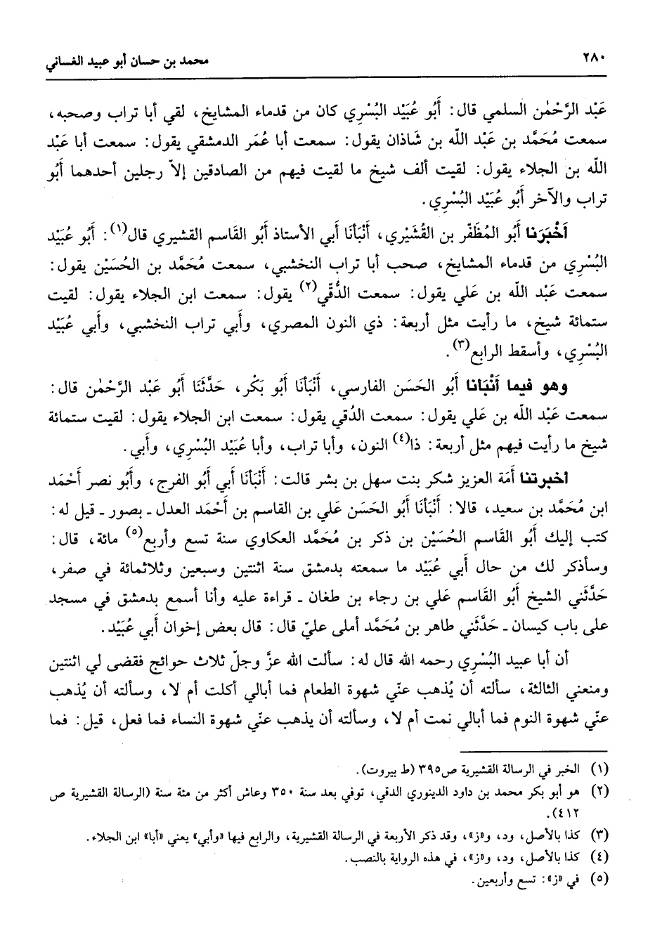 عبد الرحمن السلمي قال أبو عبيد البسري كان من قدماء المشايخ لقي أبا تراب وصحبه سمعت محمد بن عبد الله بن شاذان يقول سمعت أبا عمر الدمشقي يقول سمعت ابا عبد الله بن الجلاء يقول لقيت ألف شيخ ما لقيت فيهم من الصادقين إلا رجلين أحدهما أبو تراب والاخر أبو عبيد البسري أخبرنا أبو المظفر بن القشيري أنبأنا أبي الأستاذ أبو القاسم القشيري قال (1) أبو عبيد البسري من قدماء المشايخ صحب أبا تراب النخشبي سمعت محمد بن الحسين يقول سمعت عبد الله بن علي يقول سمعت الدقي (2) يقول سمعت أبن الجلاء يقول لقيت ستمائة شيخ ما رأيت مثل أربعة ذي النون المصري وأبي تراب النخشبي وأبي عبيد البسري وأسقط الرابع (3) وهو فيما أنبأنا أبو الحسن الفارسي أنبأنا أبو بكر حدثنا أبو عبد الرحمن قال سمعت عبد الله بن علي يقول سمعت الدقي يقول سمعت ابن الجلاء يقول لقيت ستمائة شيخ ما رأيت فيهم مثل أربعة ذا (4) النون وأبا تراب وابا عبيد البسري وأبي أخبرتنا أمة العزيز شكر بنت سهل بن بشر قالت أنبأنا أبي أبو الفرج وأبو نصر أحمد ابن محمد بن سعيد قالا أنبأنا أبو الحسن علي بن القاسم بن أحمد العدل بصور قيل له كتب إليك أبو القاسم الحسين بن ذكر بن محمد العكاوي سنة تسع وأربع (5) مائة قال وسأذكر لك من حال ابي عبيد ما سمعته بدمشق سنة اثنتين وسبعين وثلاثمائة في صفر حدثني الشيخ أبو القاسم علي بن رجاء بن طعان قراءة عليه وانا أسمع بدمشق في مسجد على باب كيسان حدثني طاهر بن محمد أملى علي قال قال بعض إخوان أبي عبيد أن أبا عبيد البسري رحمه الله قال له سألت الله عز وجل ثلاث حوائج فقضى لي اثنتين ومنعني الثالثة سألته أن يذهب عني شهوة الطعام فما أبالي أكلت أم لا وسألته أن يذهب عني شهوة النوم فما أبالي نمت أم لا وسألته أن يذهب عني شهوة النساء فما فعل قيل فما