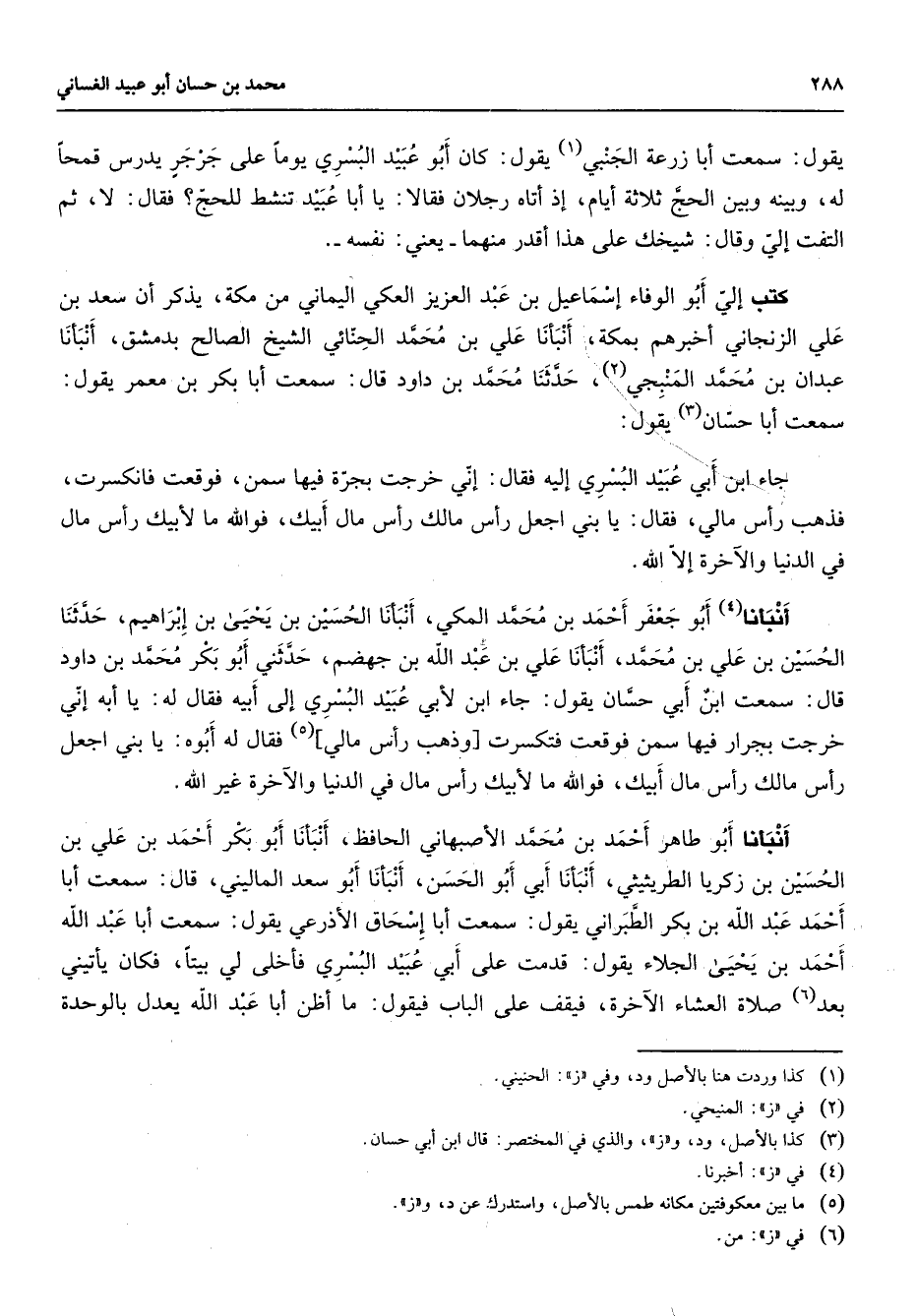 يقول سمعت أبا زرعة الجنبي (1) يقول كان أبو عبيد البسري يوما على جرجر يدرس قمحا له وبينه وبين الحج ثلاثة أيام إذ أتاه رجلان فقالا يا أبا عبيد تنشط للحج فقال لا ثم التفت إلي وقال شيخك على هذا أقدر منهما يعني نفسه كتب إلي أبو الوفاء إسماعيل بن عبد العزيز العكي اليماني من مكة يذكر أن سعد بن علي الرنجاني أخبرهم بمكة أنبأنا علي بن محمد الحنائي الشيخ الصالح بدمشق أنبأنا عبدان بن محمد المنبجي (2) حدثنا محمد بن داود قال سمعت أبا بكر بن معمر يقول سمعت أبا حسان (3) يقول جاء ابن أبي عبيد البسري إليه فقال إني خرجت بجرة فيها سمن فوقعت فانكسرت فذهب رأس مالي فقال يا بني أجعل رأس مالك رأس مال أبيك فوالله ما لأبيك رأس مال في الدنيا والآخرة إلا الله أنبأنا (4) أبو جعفر أحمد بن محمد المكي أنبأنا الحسين بن يحيى بن إبراهيم حدثنا الحسين بن علي بن محمد أنبأنا علي بن عبد الله بن جهضم حدثني أبو بكر محمد بن داود قال سمعت ابن أبي حسان يقول جاء ابن لأبي عبيد البسري إلي أبيه فقال له يا أبه إني خرجت بجرار فيها سمن فوقعت فتكسرت وذهب رأس مالي (5) فقال له أبوه يا بني اجعل رأس مالك رأس مال أبيك فوالله ما لأبيك راس مال في الدنيا والآخرة غير الله أنبأنا أبو طاهر أحمد بن محمد الأصبهاني الحافظ أنبأنا أبو بكر أحمد بن علي بن الحسين بن زكريا الطريثيثي أنبأنا أبي أبو الحسن أنبأنا أبو سعد الماليني قال سمعت أبا أحمد عبد الله بن بكر الطبراني يقول سمعت أبا إسحاق الأذرعي يقول سمعت أبا عبد الله أحمد بن يحيى الجلاء يقول قدمت على أبي عبيد البسري فأخلى لي بيتا فكان يأتيني بعد (6) صلاة العشاء الآخرة فيقف على الباب فيقول ما أظن أبا عبد الله يعدل بالوحدة