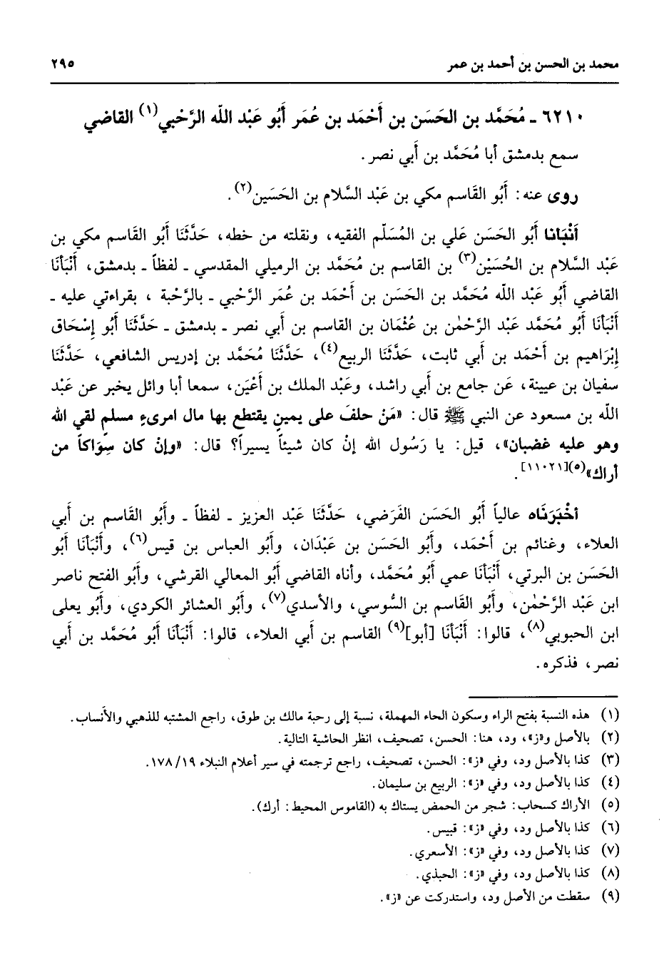 6210 - محمد بن الحسين بن أحمد بن عمر أبو عبد الله الرحبي (1) القاضي سمع بدمشق أبا محمد بن أبي نصر روى عنه أبو القاسم مكي بن عبد السلام بن الحسين (2) أنبأنا أبو الحسن علي بن المسلم الفقية ونقلته من خطه حدثنا أبو القاسم مكي بن عبد السلام بن الحسين (3) بن القاسم بن محمد بن الرميلي المقدسي لفظا بدمشق أنبأنا القاضي أبو عبد الله محمد بن الحسن بن أحمد بن عمر الرحبي بالرحبة بقراءتي عليه أنبأنا أبو محمد عبد الرحمن بن عثمان بن القاسم بن أبي نصر بدمشق حدثنا أبو إسحاق إبراهيم بن أحمد بن ابي ثابت حدثنا الربيع حدثنا (4) محمد بن إدريس الشافعي حدثنا سفيان بن عيينه عن جامع بن أبي راشد وعبد الملك بن أعين سمعا أبا وائل يخبر عن عبد الله بن مسعود عن النبي (صلى الله عليه وسلم) قال من حلف على يمين يقتطع بها مال أمرئ مسلم لقي الله وهو عليه غضبان قيل يا رسول الله إن كان شيئا يسيرا قال وإن كان سواكا من أراك (5)