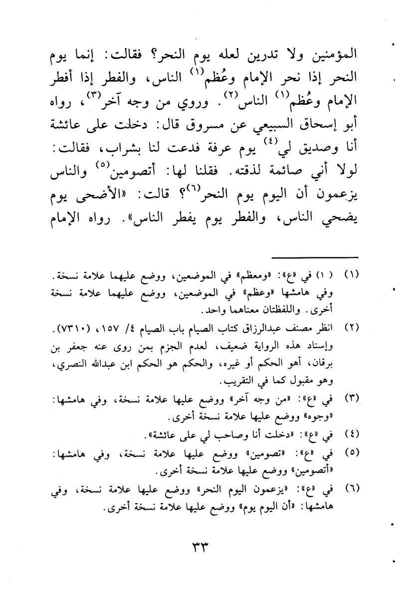 تدرين لعله يوم النحر؟ فقالت: إنما يوم النحر إذا نحر الإمام وعظم (¬1) الناس، والفطر إذا أفطر الإمام وعظم (¬2) الناس (¬3) . وروي من وجه آخر (¬4) . رواه أبو إسحاق السبيعي عن مسروق