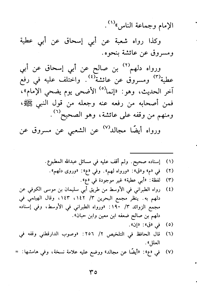 ورواه دلهم (¬3) بن صالح عن أبي إسحاق عن أبي عطية (¬4) ومسروق عن عائشة (¬5) . واختلف عليه في رفع آخر الحديث، وهو: "إنما (¬6) الأضحى يوم يضحي الإمام "، فمن أصحابه من رفعه عنه وجعله من قول النبي صلى الله عليه وسلم، ومنهم من وقفه على عائشة، وهو الصحيح (¬7) .