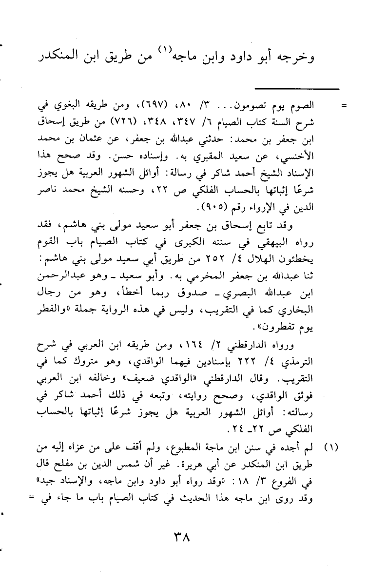 (¬1) لم أجده في سنن ابن ماجه المطبوع، ولم أقف على من عزاه إليه من طريق ابن المنكدر عن أبي هريرة. غير أن شمس الدين بن مفلح قال في الفروع 3 / 18: '' وقد رواه أبو داود وابن ماجه، والإسناد جيد'' وقد روى ابن ماجه هذا الحديث في كتاب الصيام باب ما جاء في شهري العيد 1 / 531، رقم (1660) : عن محمد بن عمر المقري ثنا حماد بن زيد عن أيوب عن محمد بن سيرين عن أبي هريرة قال قال رسول الله صلى الله عليه وسلم.. فذكره