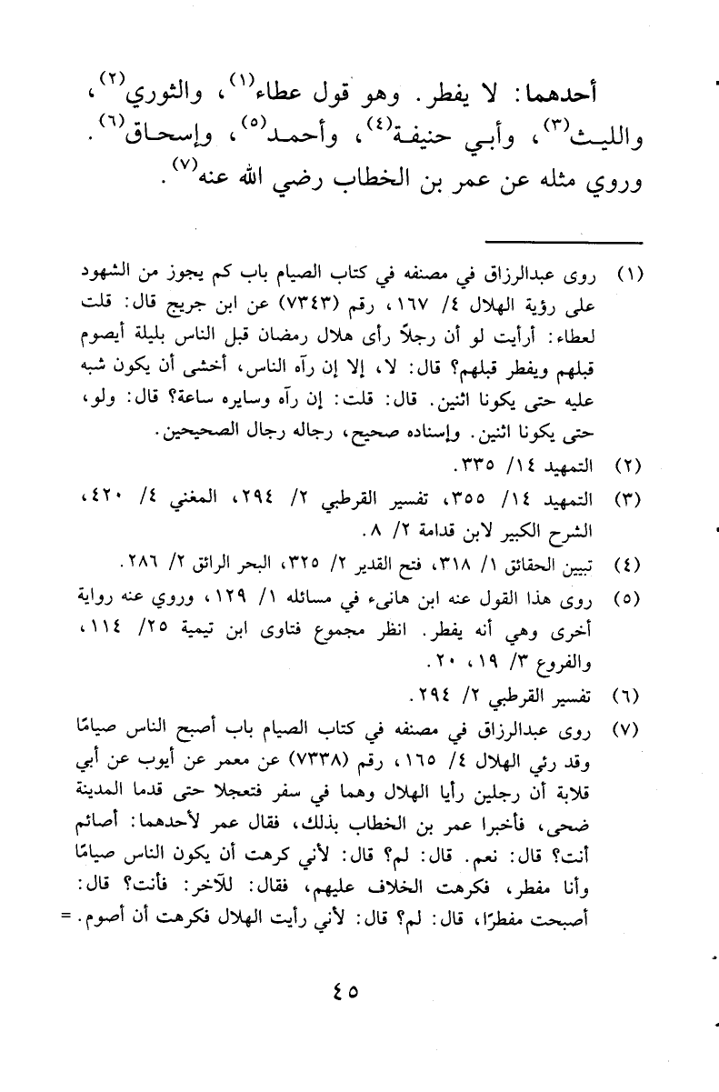 (¬7) روى عبد الرزاق في مصنفه في كتاب الصيام باب أصبح الناس صياما وقد رئي الهلال 4 / 165، رقم (7338) عن معمر عن أيوب عن أبي قلابة أن رجلين رأيا الهلال وهما في سفر فتعجلا حتى قدما المدينة ضحى، فأخبرا عمر بن الخطاب بذلك، فقال عمر لأحدهما: أصائم أنت؟ قال: نعم. قال: لم؟ قال: لأني كرهت أن يكون الناس صياما وأنا مفطر، فكرهت الخلاف عليهم، فقال: للآخر: فأنت؟ قال: أصبحت مفطرا، قال: لم؟ قال: لأني رأيت الهلال فكرهت أن أصوم. فقال للذي أفطر: لولا هذا- يعني الذي صام- لرددنا شهادتك ولأوجعنا رأسك. ثم أمر الناس فأفطروا، وخرج. ورجاله ثقات، لكنه مرسل، أبو قلابة لم يدرك زمن عمر بن الخطاب رضي الله عنه. انظر المراسيل لابن أبي حاتم ص 109، 110.