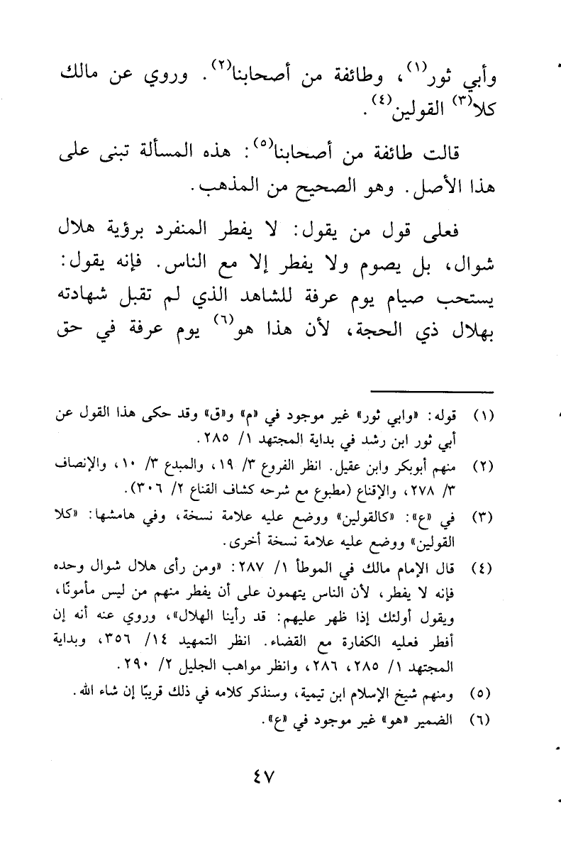 (¬4) قال الإمام مالك في الموطأ 1 / 287: ''ومن رأى هلال شوال وحده فإنه لا يفطر، لأن الناس يتهمون على أن يفطر منهم من ليس مأمونا، ويقول أولئك إذا ظهر عليهم: قد رأينا الهلال ''، وروي عنه أنه إن أفطر فعليه الكفارة مع القضاء. انظر التمهيد 14 / 356، وبداية المجتهد 1 / 285، 286، وانظر مواهب الجليل 2 / 290.