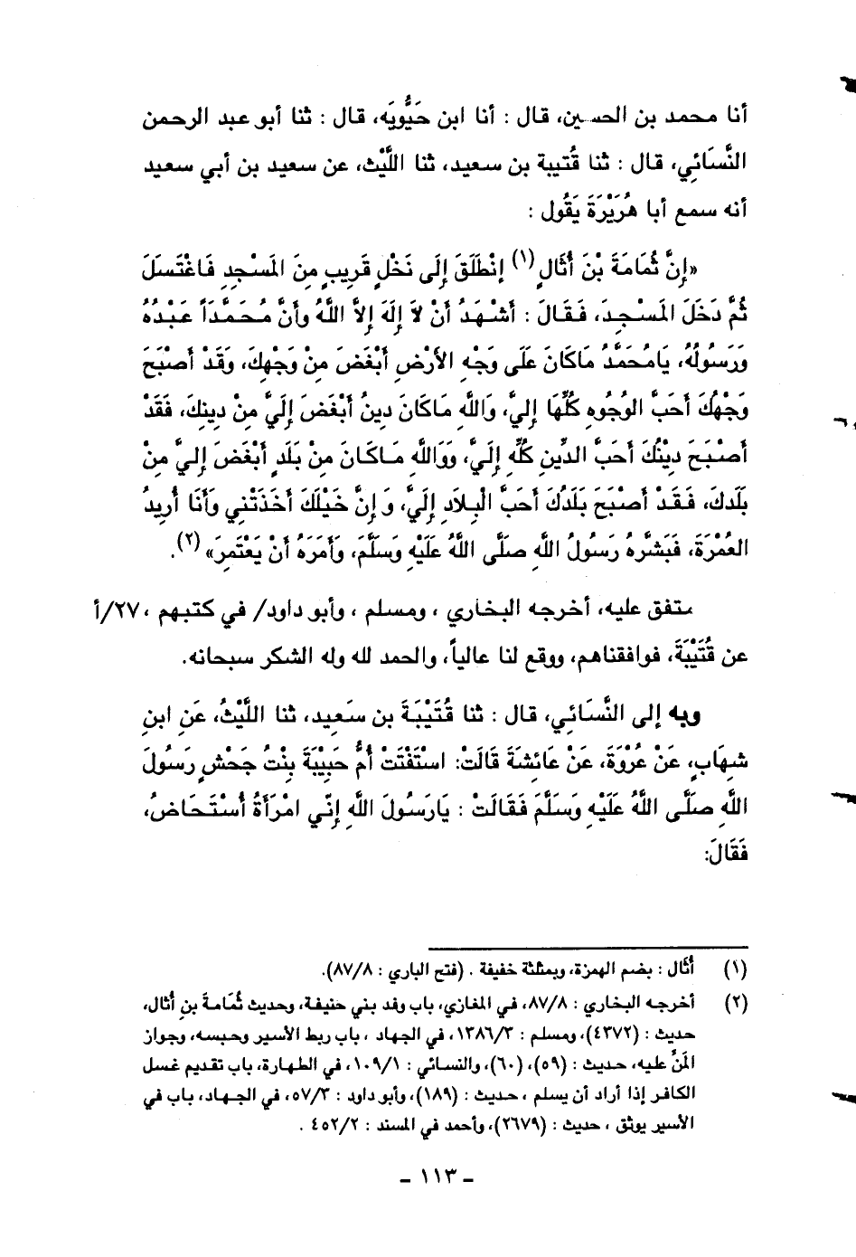 ((إن ثمامة بن أثالٍ انطلق إلى نخلٍ قريبٍ من المسجد فاغتسل ثم دخل المسجد فقال: أشهد أن لا إله إلا الله وأن محمداً عبده ورسوله، يا محمد ما كان على وجه الأرض أبغض من وجهك، وقد أصبح وجهك أحب الوجوه كلها إلي، والله ما كان دين أبغض إلي من دينك، فقد أصبح دينك أحب الدين كله إلي، ووالله ما كان من بلدٍ أبغض إلي من بلدك، فقد أصبح بلدك أحب البلاد إلي، وإن خيلك أخذتني وأنا أريد العمرة، فبشره رسول الله صلى الله عليه وسلم، وأمره أن يعتمر)) .