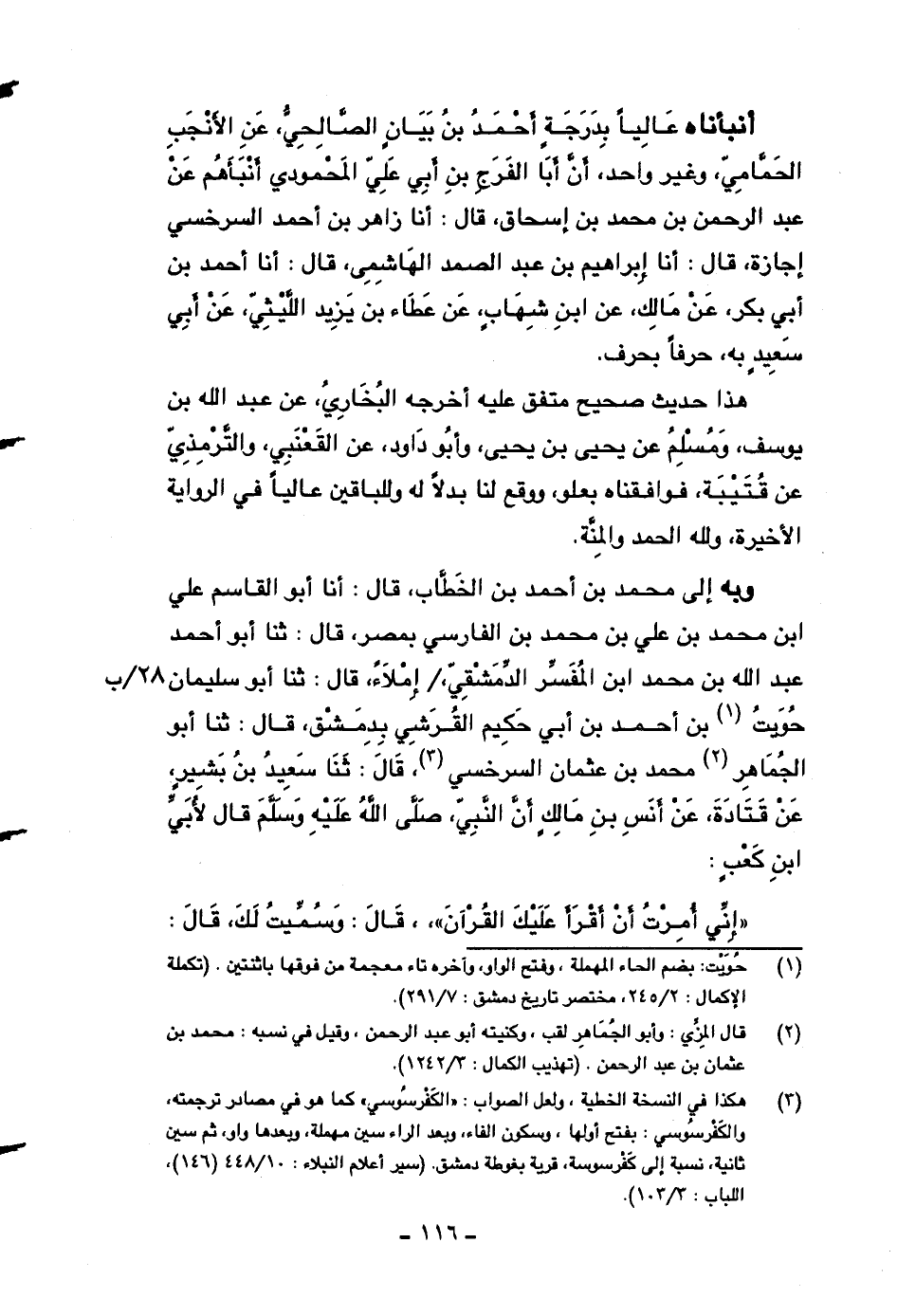 وبه إلى محمد بن أحمد بن الخطاب، قال: أنا أبو القاسم علي بن محمد بن علي بن محمد بن الفارسي بمصر، قال: ثنا أبو أحمد عبد الله بن محمد ابن المفسر الدمشقي، إملاءً، قال: ثنا أبو سليمان حويت بن أحمد بن أبي حكيم القرشي بدمشق، قال: ثنا أبو الجماهر محمد بن عثمان السرخسي، قال: ثنا سعيد بن بشيرٍ، عن قتادة، عن أنس بن مالكٍ أن النبي صلى الله عليه وسلم قال لأبي بن كعبٍ: