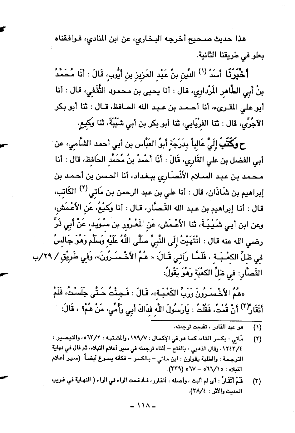 ح وكتب إلي عالياً بدرجةٍ أبو العباس بن أبي أحمد الشامي، عن أبي الفضل بن علي القاري، قال: أنا أحمد بن محمد الحافظ، قال: أنا محمد بن عبد السلام الأنصاري ببغداد، أنا الحسن بن أحمد بن إبراهيم بن شاذان، قال: أنا علي بن عبد الرحمن بن ماتي الكاتب، قال: أنا إبراهيم بن عبد الله القصار، قال: أنا وكيع، عن الأعمش، وعن ابن أبي شيبة، ثنا الأعمش، عن المعرور بن سويد، عن أبي ذر رضي الله عنه قال: انتهيت إلى النبي صلى الله عليه وسلم وهو جالس في ظل الكعبة، فلما رآني قال: ((هم الأخسرون)) ، وفي طريق القصار: في ظل الكعبة وهو يقول: