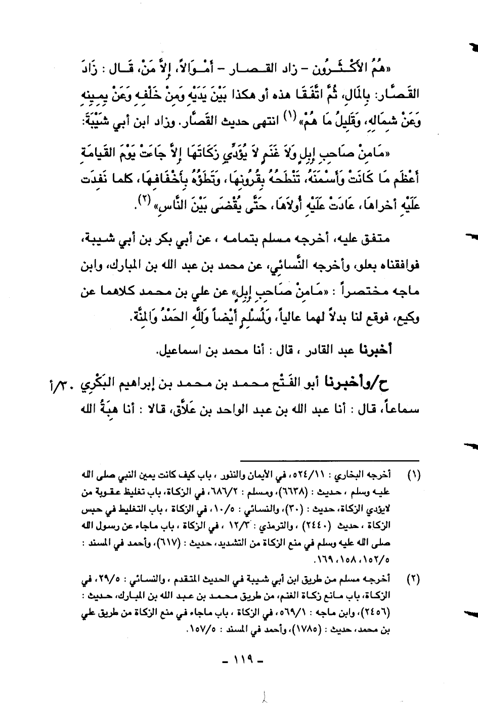 متفق عليه، أخرجه مسلم بتمامه، عن أبي بكر بن أبي شيبة، فوافقناه بعلو، وأخرجه النسائي، عن محمد بن عبد الله بن المبارك، وابن ماجه مختصراً: ((ما من صاحب إبلٍ)) عن علي بن محمد كلاهما عن وكيع، فوقع لنا بدلاً لهما عالياً، ولمسلمٍ أيضاً وله الحمد والمنة.