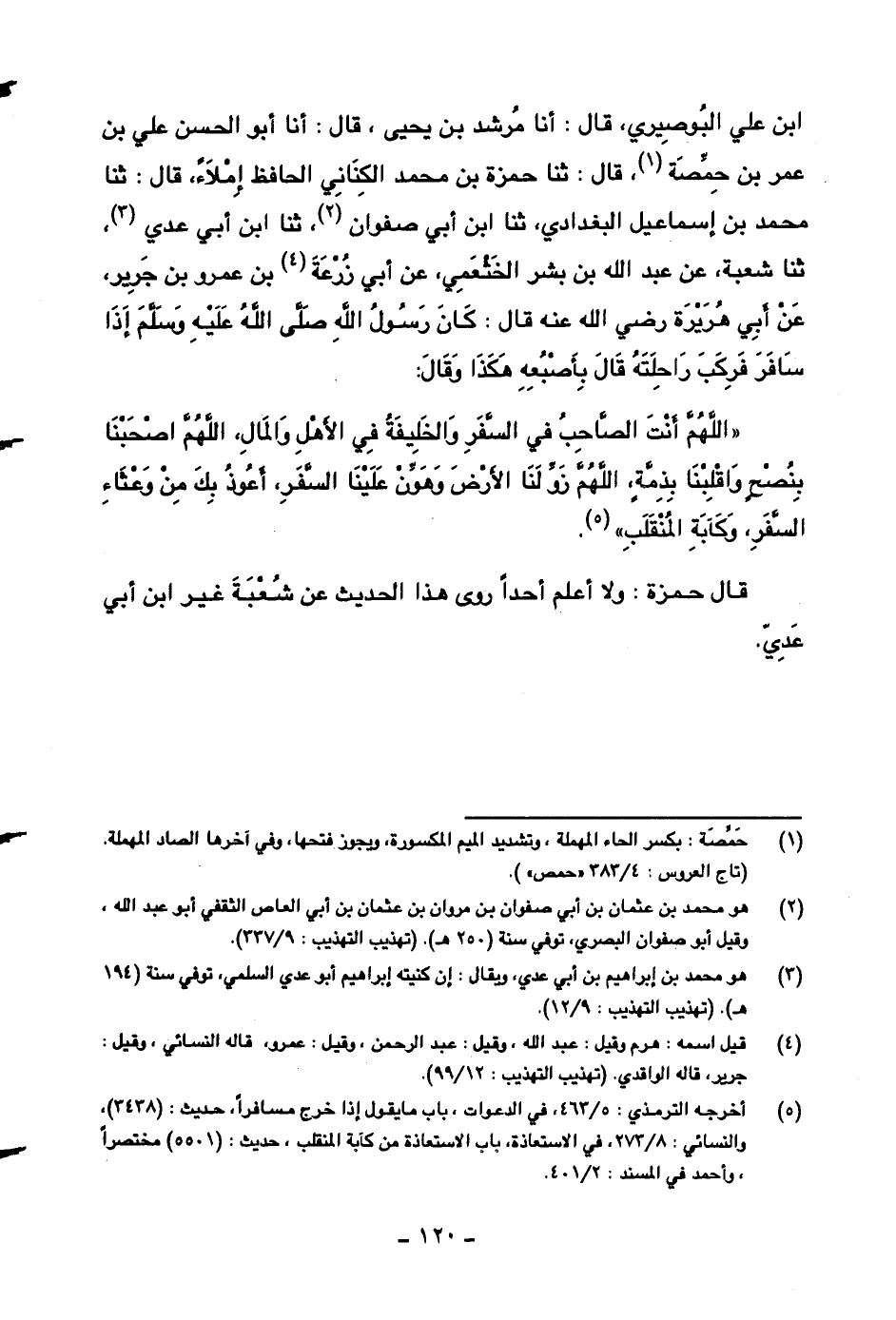 ابن علي البوصيري، قال: أنا مرشد بن يحيى، قال: أنا أبو الحسن علي بن عمر بن حمصة، قال: ثنا حمزة بن محمد الكناني الحافظ إملاءً قال: ثنا محمد بن إسماعيل البغدادي، ثنا ابن أبي صفوان، ثنا ابن أبي عدي، ثنا شعبة، عن عبد الله بن بشر الخثعمي، عن أبي زرعة بن عمرو بن جرير، عن أبي هريرة رضي الله عنه قال: كان رسول الله صلى الله عليه وسلم إذا سافر فركب راحلته قال بأصبعه هكذا وقال: