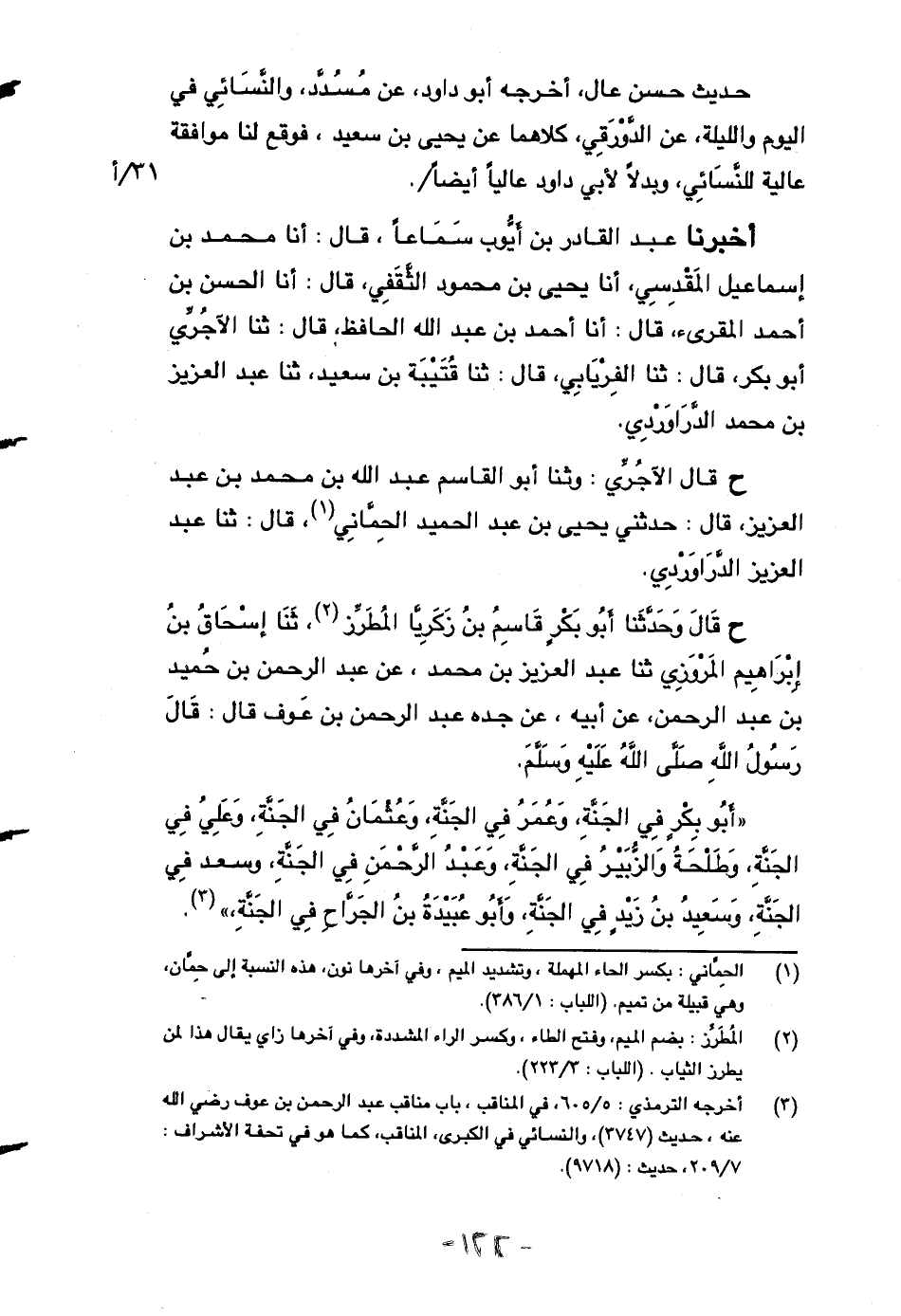 أخبرنا عبد القادر بن أيوب سماعاً، قال: أنا محمد بن إسماعيل المقدسي، أنا يحي بن محمود الثقفي، قال: أنا الحسن بن أحمد المقرئ قال: أنا أحمد بن عبد الله الحافظ، قال: ثنا الآجري أبو بكر، قال: ثنا الفريابي، قال: ثنا قتيبة بن سعيد، ثنا عبد العزيز بن محمد الدراوردي.