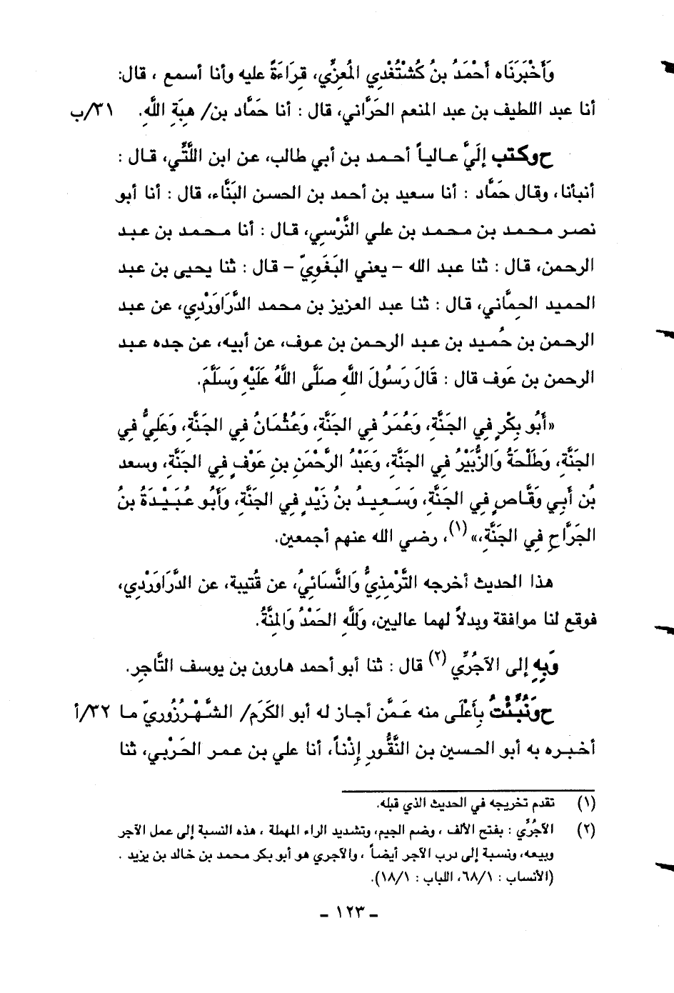 ح وكتب إلي عالياً أحمد بن أبي طالب، عن ابن اللتي، قال: أنبأنا، وقال حماد: أنا سعيد بن أحمد بن الحسن البناء، قال: أنا أبو نصر محمد بن محمد بن علي النرسي، قال: أنا محمد بن عبد الرحمن، قال: ثنا عبد الله -يعني البغوي- قال: ثنا يحيى بن عبد الحميد الحماني، قال: ثنا عبد العزيز بن محمد الدراوردي، عن عبد الرحمن بن حميد بن عبد الرحمن بن عوف، عن أبيه، عن جده عبد الرحمن بن عوف قال: قال رسول الله صلى الله عليه وسلم: