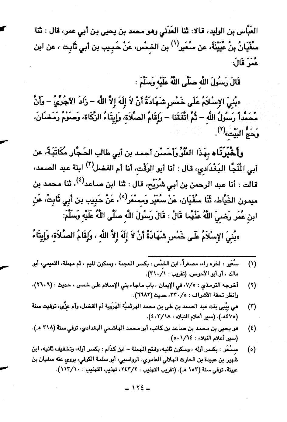وأخبرناه بهذا العلو وأحسن أحمد بن أبي طالب الحجار مكاتبةً، عن أبي المنجا البغدادي، قال: أنا أبو الوقت، أنا أم الفضل ابنة عبد الصمد، قالت: أنا عبد الرحمن بن أبي شريح، قال: ثنا ابن صاعد، ثنا محمد بن ميمون الخياط، ثنا سفيان، عن سعير ومسعر، عن حبيب بن أبي ثابت، عن ابن عمر رضي الله عنهما قال: قال رسول الله صلى الله عليه وسلم: