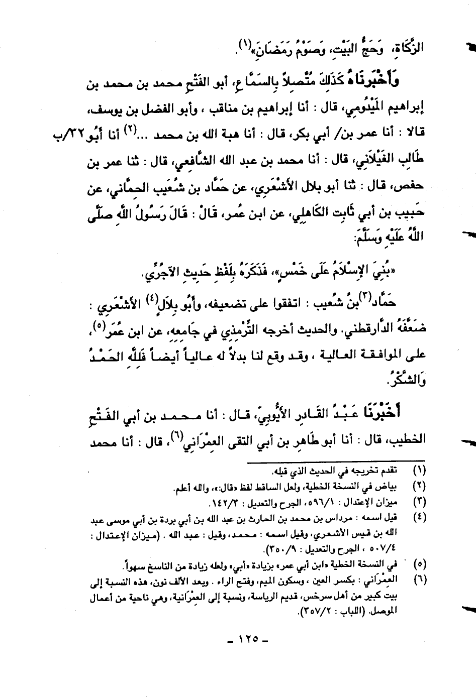 وأخبرناه كذلك متصلاً بالسماع، أبو الفتح محمد بن محمد بن إبراهيم الميدومي، قال: أنا إبراهيم بن مناقب، وأبو الفضل بن يوسف، قالا: أنا عمر بن أبي بكر، قال: أنا هبة الله بن محمد.. .. أنا أبو طالب الغيلاني، قال: أنا محمد بن عبد الله الشافعي، قال: ثنا عمر بن حفص، قال: ثنا أبو بلال الأشعري، عن حماد بن شعيب الحماني، عن حبيب بن أبي ثابت الكاهلي، عن ابن عمر، قال: قال رسول لله صلى الله عليه وسلم: