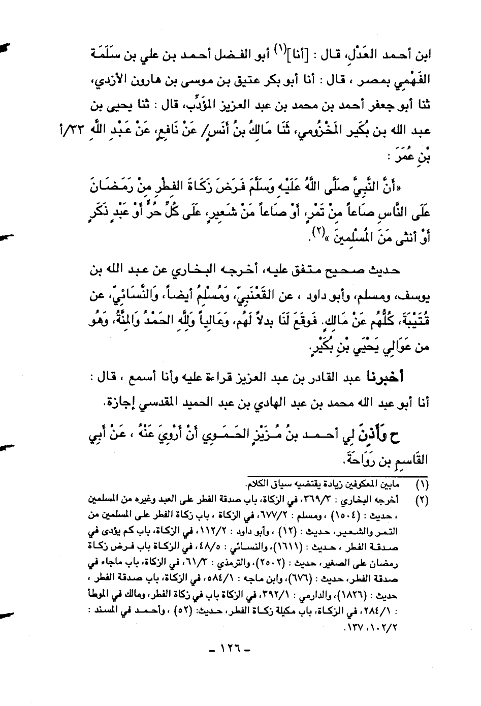 ابن أحمد العدل، قال: [أنا] أبو الفضل أحمد بن علي بن سلمة الفهمي بمصر، قال: أنا أبو بكر عتيق بن موسى بن هارون الأزدي، ثنا أبو جعفر أحمد بن محمد بن عبد العزيز المؤدب، قال: ثنا يحيى بن عبد الله بن بكير المخزومي، ثنا مالك بن أنسٍ عن نافعٍ، عن عبد الله بن عمر: