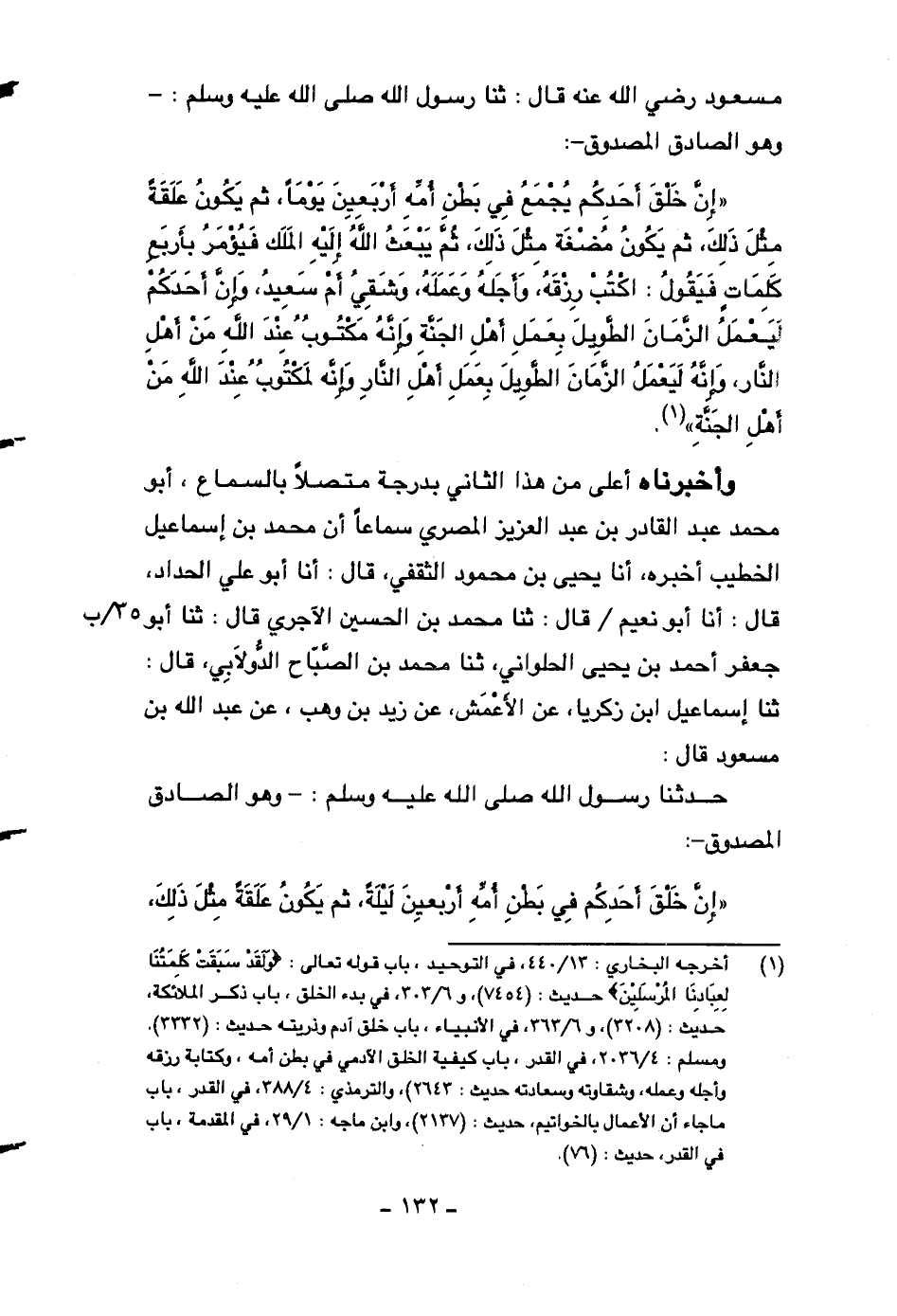 مسعود رضي الله عنه قال: ثنا رسول الله صلى الله عليه وسلم: وهو الصادق المصدوق: