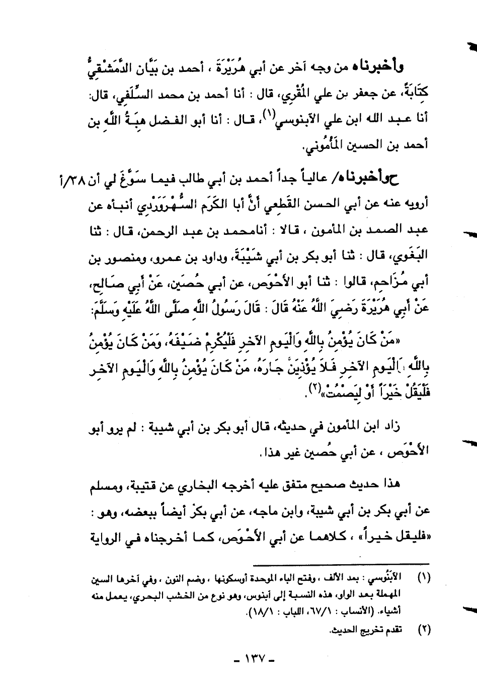 ح وأخبرناه عالياً جداً أحمد بن أبي طالب فيما سوغ لي أن أرويه عنه عن أبي الحسن القطعي أن أبا الكرم السهروردي أنبأه عن عبد الصمد بن المأمون، قالا: أنا محمد بن عبد الرحمن، قال: ثنا البغوي، قال: ثنا أبو بكر بن أبي شيبة، وداود بن عمرو، ومنصور بن أبي مزاحم، قالوا: ثنا أبو الأحوص، عن أبي حصين، عن أبي صالح، عن أبي هريرة رضي الله عنه قال: قال رسول الله صلى الله عليه وسلم:
