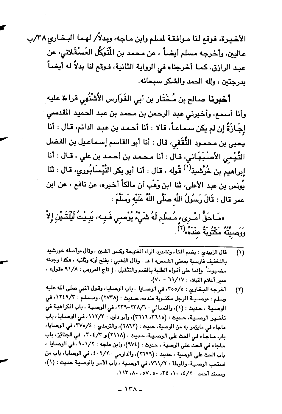 ((ما حق امرئٍ مسلم له شيء يوصي فيه، يبيت ليلتين إلا ووصيته مكتوبة عنده)) .