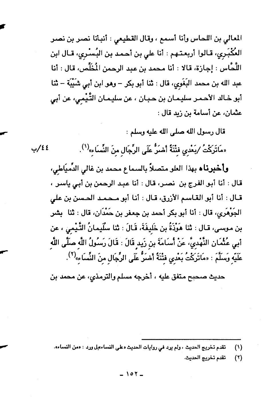 وأخبرناه بهذا العلو متصلاً بالسماع محمد بن غالي الدمياطي، قال: أنا أبو الفرج بن نصر، قال: أنا عبد الرحمن بن أبي ياسر، قال: أنا أبو القاسم الأزرق، قال: أنا أبو محمد الحسن بن علي الجوهري، قال: أنا أبو بكر أحمد بن جعفر بن حمدان، قال: ثنا بشر بن موسى، قال: ثنا هوذة بن خليفة، قال: ثنا سليمان التيمي، عن أبي عثمان النهدي، عن أسامة بن زيدٍ قال: قال رسول الله صلى الله عليه وسلم: ((ما تركت بعدي فتنةً أضر على الرجال من النساء)) .