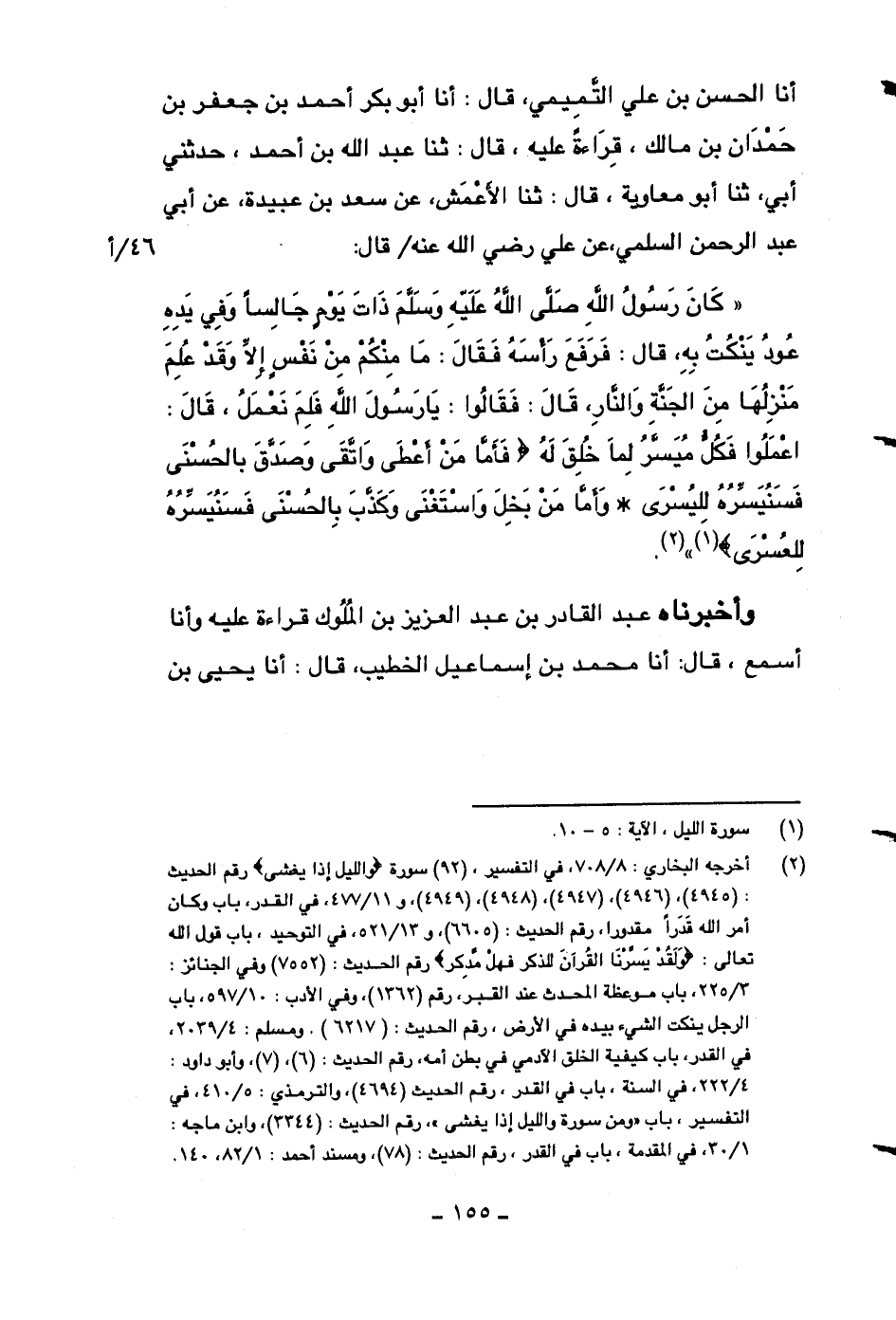 ((كان رسول الله صلى الله عليه وسلم ذات يومٍ جالساً وفي يده عود ينكت به، قال: فرفع رأسه فقال: ما منكم من نفسٍ إلا وقد علم منزلها من الجنة والنار، قال: فقالوا: يا رسول الله فلم نعمل، قال: اعملوا فكل ميسر لما خلق له {فأما من أعطى واتقى. وصدق بالحسنى. فسنيسره لليسرى. وأما من بخل واستغنى وكذب بالحسنى. فسنيسره للعسرى} )) .