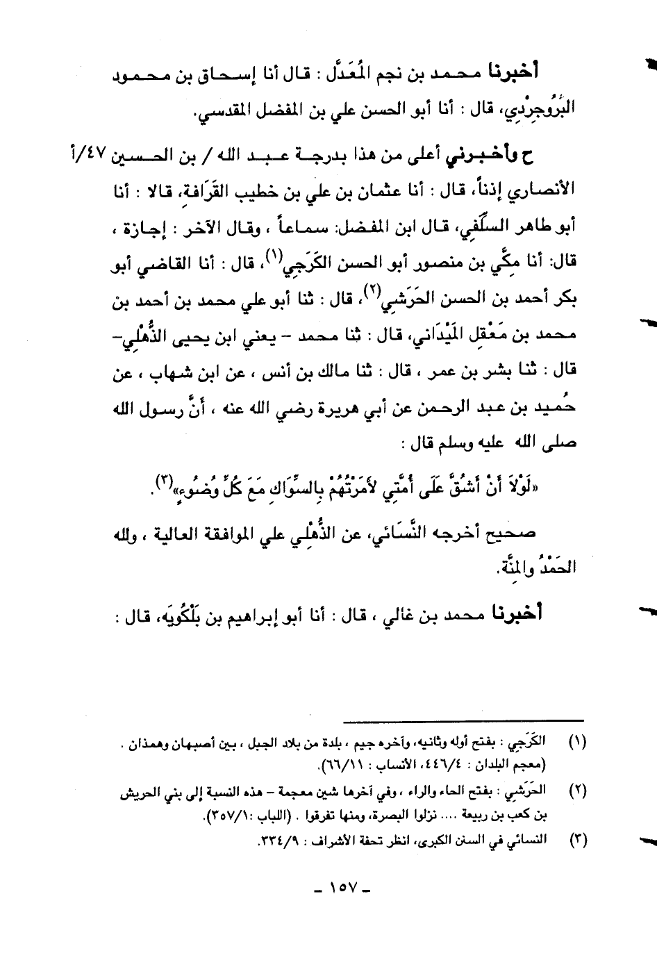 ح وأخبرني أعلى من هذا بدرجة عبد الله بن الحسين الأنصاري إذناً، قال: أنا عثمان بن علي بن خطيب القرافة، قالا: أنا أبو طاهر السلفي، قال ابن المفضل سماعاً: وقال الآخر: إجازة، قال: أنا مكي بن منصور أبو الحسن الكرجي، قال: أنا القاضي أبو بكر أحمد بن الحسن الحرشي، قال: ثنا أبو علي محمد بن أحمد بن محمد بن معقل الميداني، قال: ثنا محمد -يعني ابن يحيى الذهلي- قال: ثنا بشر بن عمر، قال: ثنا مالك بن أنس، عن ابن شهاب، عن حميد بن عبد الرحمن عن أبي هريرة رضي الله عنه، أن رسول الله صلى الله عليه وسلم قال: