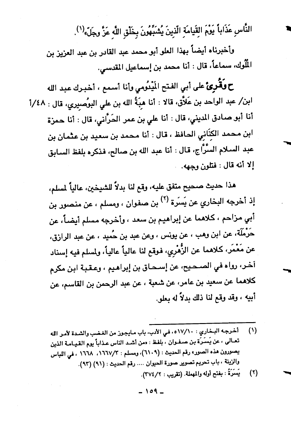 ح وقرئ على أبي الفتح الميدومي وأنا أسمع، أخبرك عبد الله ابن عبد الواحد بن علاق، قالا: أنا هبة الله بن علي البوصيري، قال: أنا أبو صادق المديني، قال: أنا علي بن عمر الحراني، قال: أنا حمزة ابن محمد الكناني الحافظ، قال: أنا محمد بن سعيد بن عثمان بن عبد السلام السراج، قال: أنا عبد الله بن صالح، فذكره بلفظ السابق إلا أنه قال: فتلون وجهه.