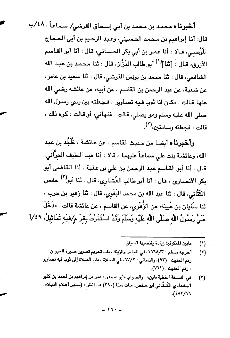 وأخبرناه أيضاً من حديث القاسم، عن عائشة، غلبك بن عبد الله، وعائشة بنت علي سماعاً عليهما، قالا: أنا عبد اللطيف الحراني، قال: أنا أبو القاسم عبد الرحمن بن علي بن عقبة، أنا القاضي أبو بكر الأنصاري، قال: أنا أبو طالب العشاري، قال: ثنا أبو حفص الكتاني، قال: ثنا عبد الله بن محمد البغوي، قال: ثنا زهير بن حرب، ثنا سفيان بن عيينة، عن الزهري، عن القاسم، عن عائشة قالت: ((دخل علي رسول الله صلى الله عليه وسلم وقد استترت بقرامٍ فيه تماثيل،