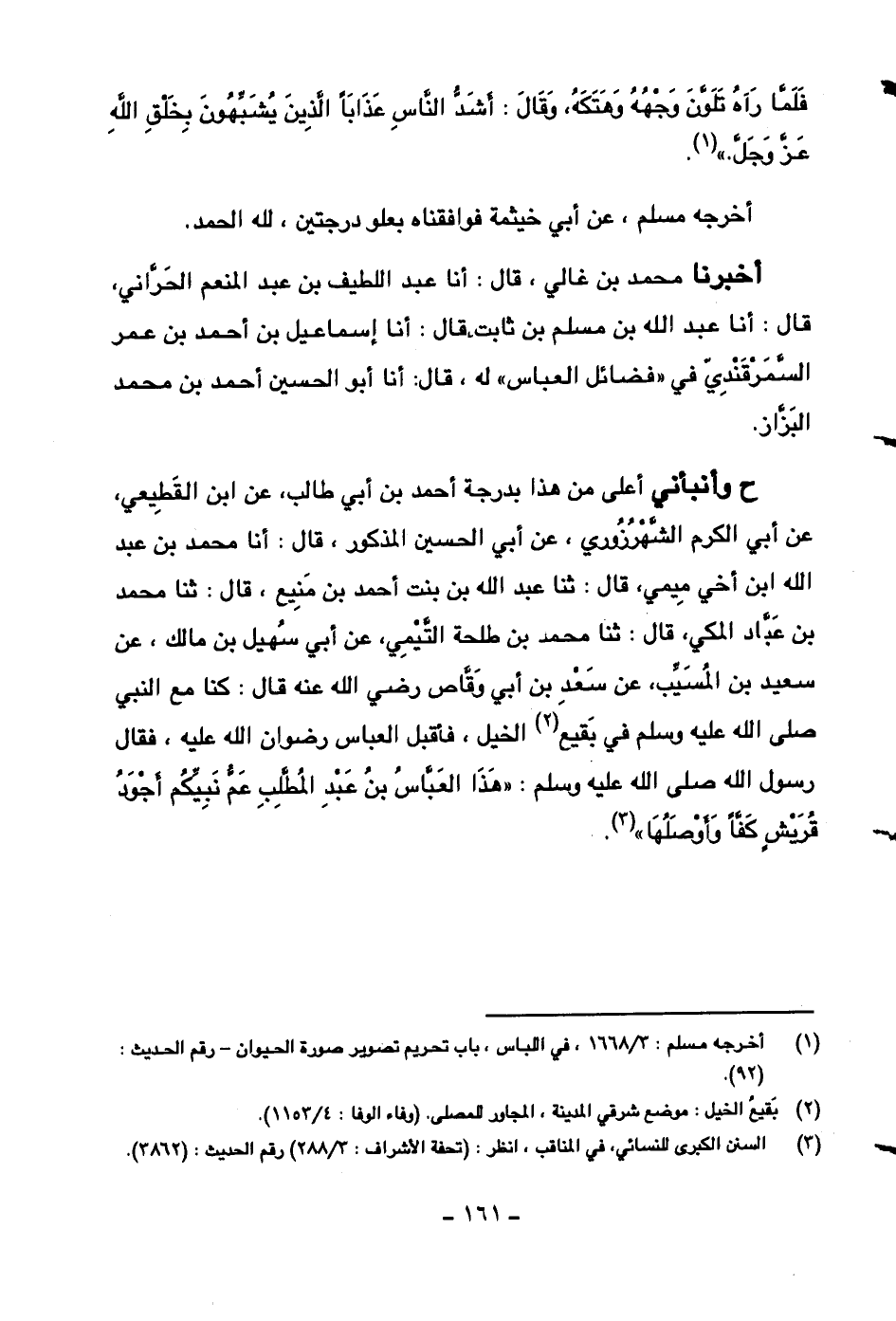 ح وأنبأني أعلى من هذا بدرجة أحمد بن أبي طالب، عن ابن القطيعي، عن أبي الكرم الشهرزوري، عن أبي الحسين المذكور، قال: أنا محمد بن عبد الله ابن أخي ميمي، قال: ثنا عبد الله بن بنت أحمد بن منيع، قال: ثنا محمد بن عباد المكي، قال: ثنا محمد بن طلحة التيمي، عن أبي سهيل بن مالك، عن سعيد بن المسيب، عن سعد بن أبي وقاص رضي الله عنه قال: كنا مع النبي صلى الله عليه وسلم في بقيع الخيل، فأقبل العباس رضوان الله عليه، فقال رسول الله صلى الله عليه وسلم: ((هذا العباس بن عبد المطلب عم نبيكم أجود قريشٍ كفاً وأوصلها)) .