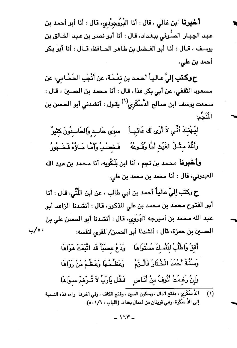 ح وكتب إلي عالياً أحمد بن نعمة، عن أنجب الحمامي، عن مسعود الثقفي، عن أبي بكر هذا، قال: أنا محمد بن الحسين، قال: سمعت يوسف ابن صالح الدسكري يقول: أنشدني أبو الحسن بن المنجم: