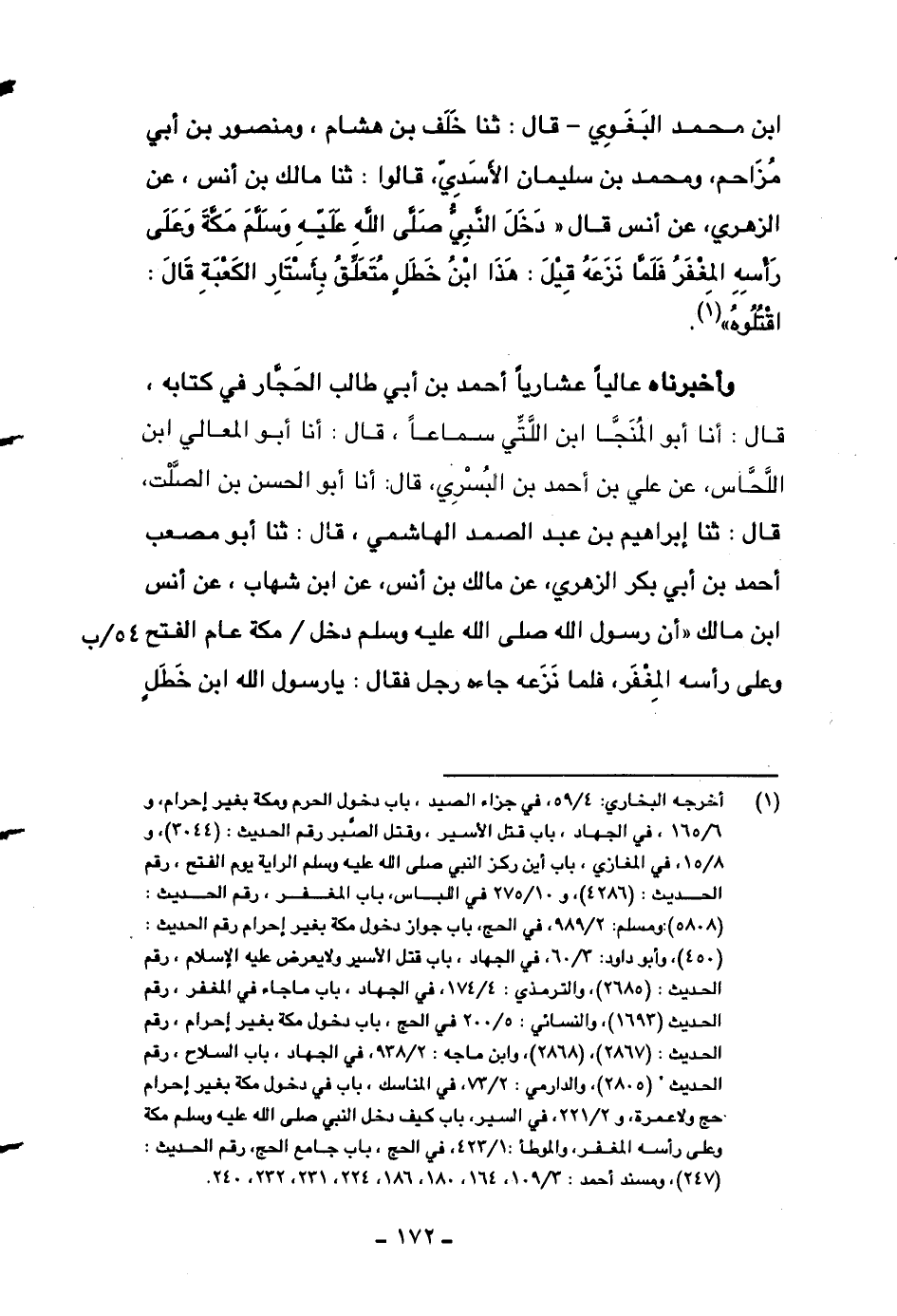 وأخبرناه عالياً عشارياً أحمد بن أبي طالب الحجار في كتابه، قال: أنا أبو المنجا ابن اللتي سماعاً، قال: أنا أبو المعالي ابن اللحاس، عن علي بن أحمد بن البسري، قال: أنا أبو الحسن بن الصلت، قال: ثنا إبراهيم بن عبد الصمد الهاشمي، قال: ثنا أبو مصعب أحمد بن أبي بكر الزهري، عن مالك بن أنس، عن ابن شهاب، عن أنس بن مالك ((أن رسول الله صلى الله عليه وسلم دخل مكة عام الفتح وعلى رأسه المغفر، فلما نزعه جاءه رجل فقال: يا رسول الله ابن خطلٍ