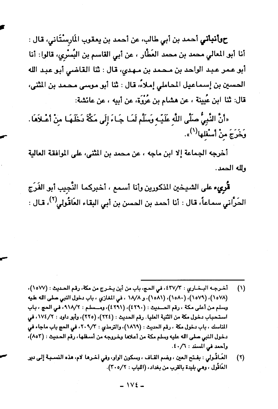 ح وأنبأني أحمد بن أبي طالب، عن أحمد بن يعقوب المارستاني، قال: أنا أبو المعالي محمد بن محمد العطار، عن أبي القاسم بن البسري، قالوا: أنا أبو عمر عبد الواحد بن محمد بن مهدي، قال: ثنا القاضي أبو عبد الله الحسين بن إسماعيل المحاملي إملاءً، قال: ثنا أبو موسى محمد بن المثنى قال: ثنا ابن عيينة، عن هشام بن عروة، عن أبيه، عن عائشة: