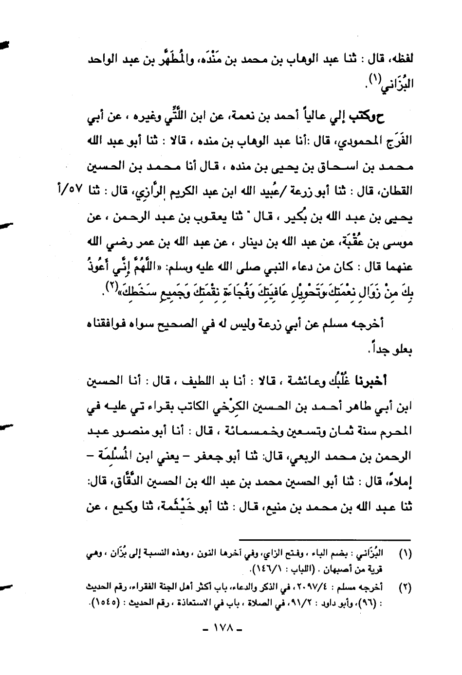 ح وكتب إلي عالياً أحمد بن نعمة، عن ابن اللتي وغيره، عن أبي الفرج المحمودي، قال: أنا عبد الوهاب بن منده، قالا: ثنا أبو عبد الله محمد بن إسحاق بن يحيى بن منده، قال أنا محمد بن الحسين القطان، قال: ثنا أبو زرعة عبيد الله ابن عبد الكريم الرازي، قال: ثنا يحيى بن عبد الله بن بكير، قال: ثنا يعقوب بن عبد الرحمن، عن موسى بن عقبة، عن عبد الله بن دينار، عن عبد الله بن عمر رضي الله عنهما قال: كان من دعاء النبي صلى الله عليه وسلم: ((اللهم إني أعوذ بك من زوال نعمتك، وتحويل عافيتك وفجاءة نقمتك وجميع سخطك)) .